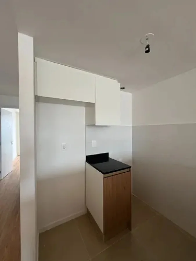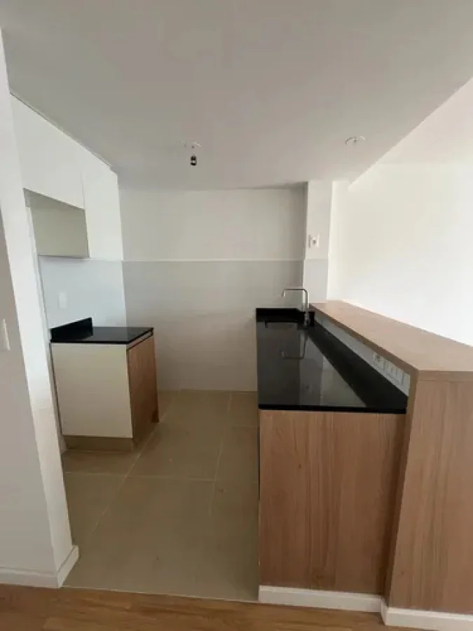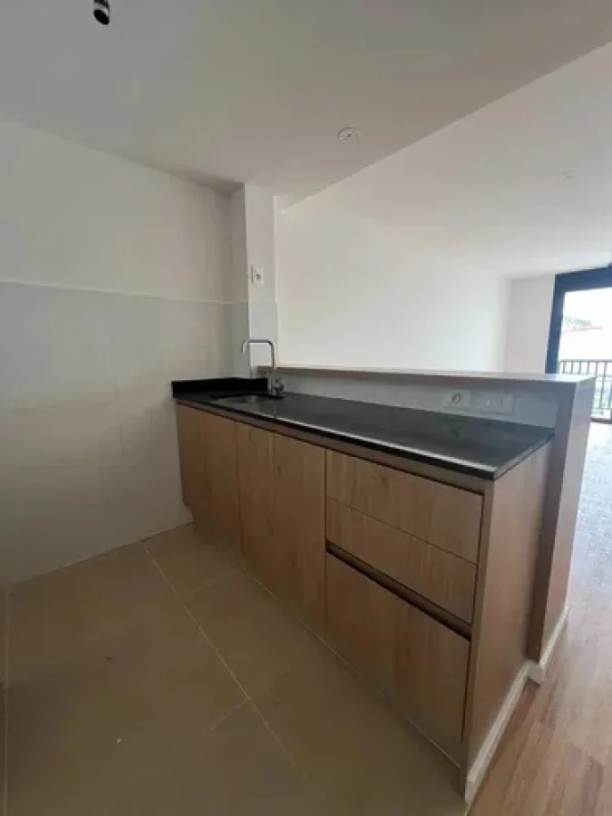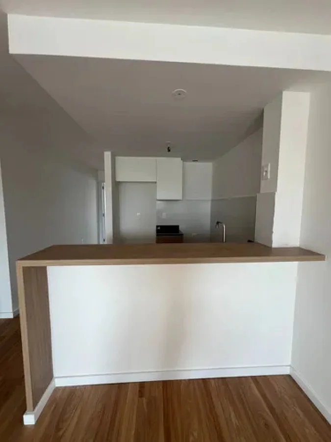 - Cocina integrada con muebles aéreos y bajo mesada, y campana.