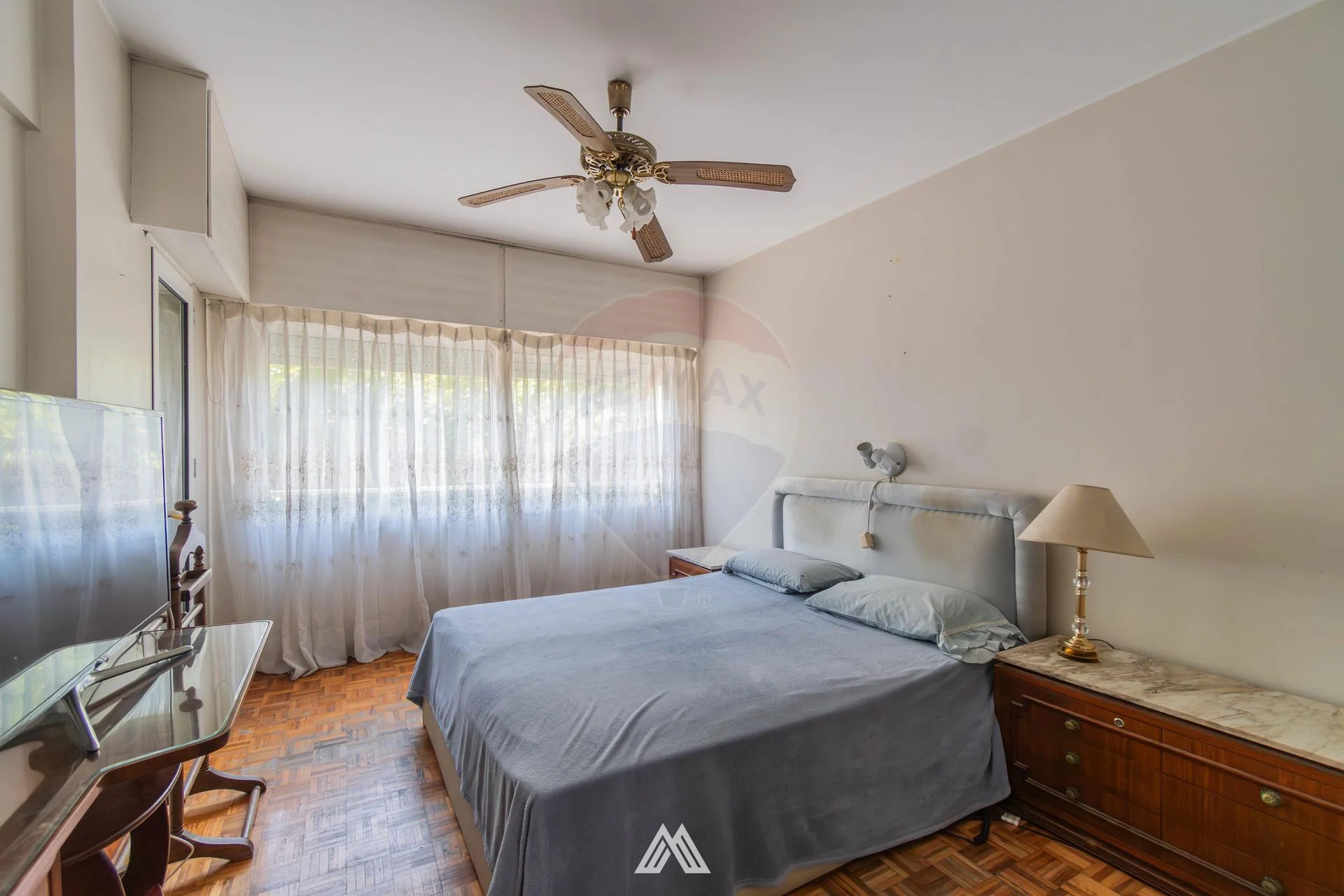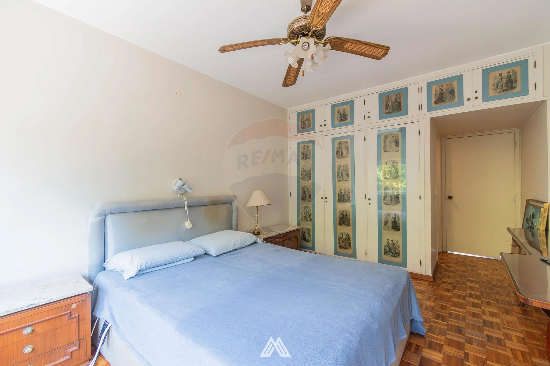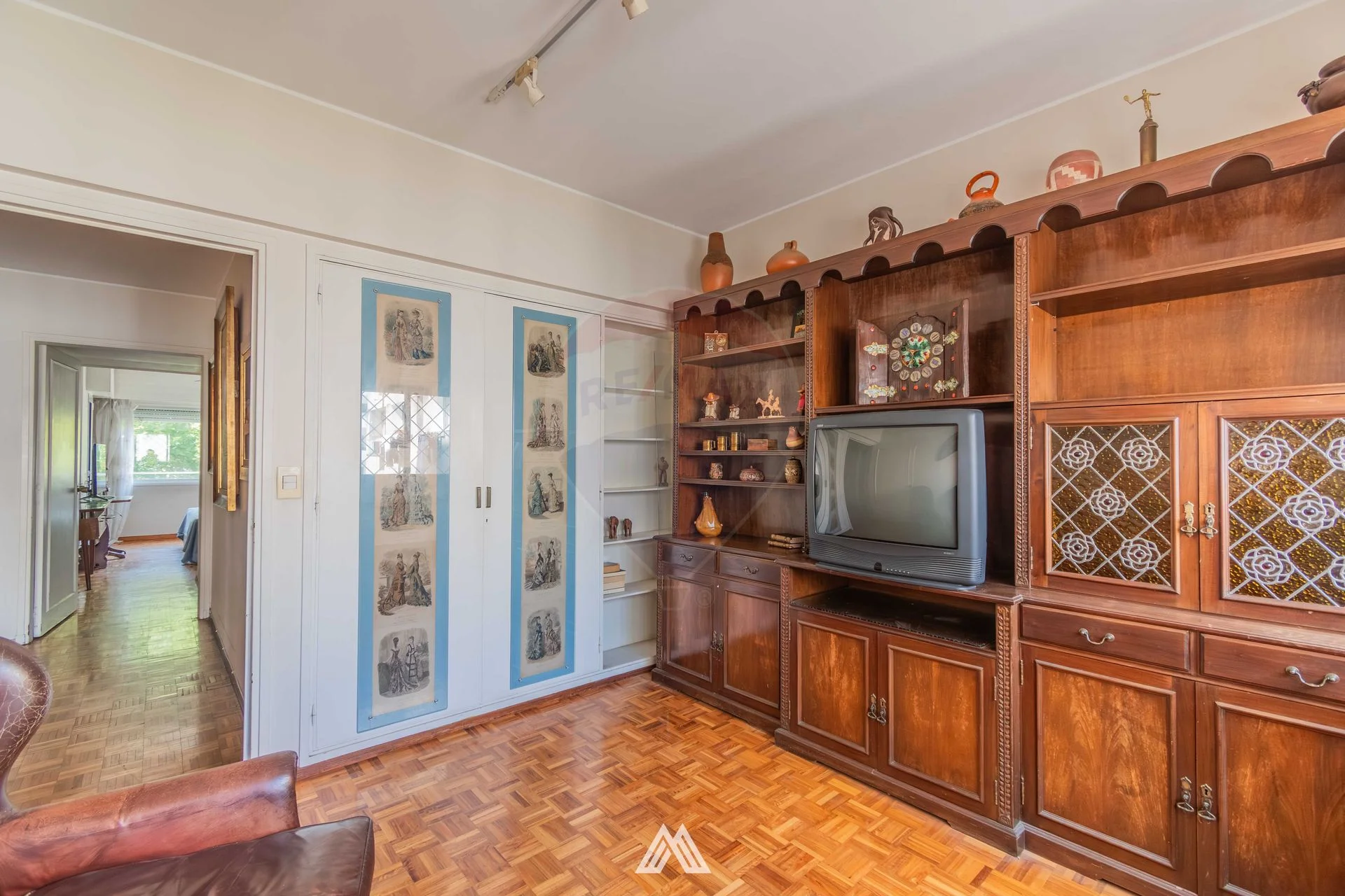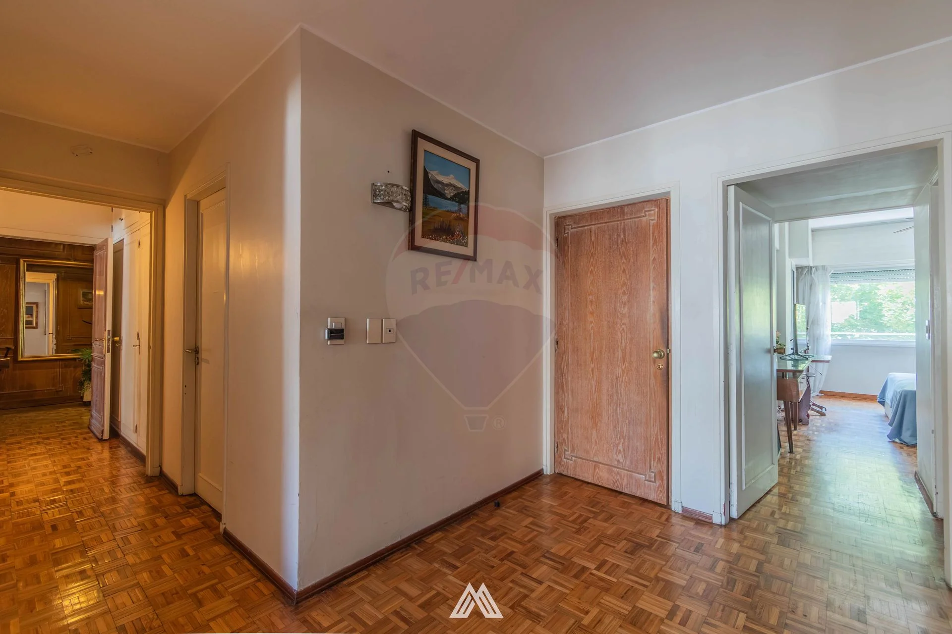 Dormitorio principal en suite con acceso directo a la terraza. Dos dormitorios secundarios orientados al contrafrente, muy luminosos y con excelente asoleamiento de tarde. Cuarto dormitorio (de servicio) con su propio baño. Todos con piso de parquet y placares empotrados que optimizan el almacenamiento.