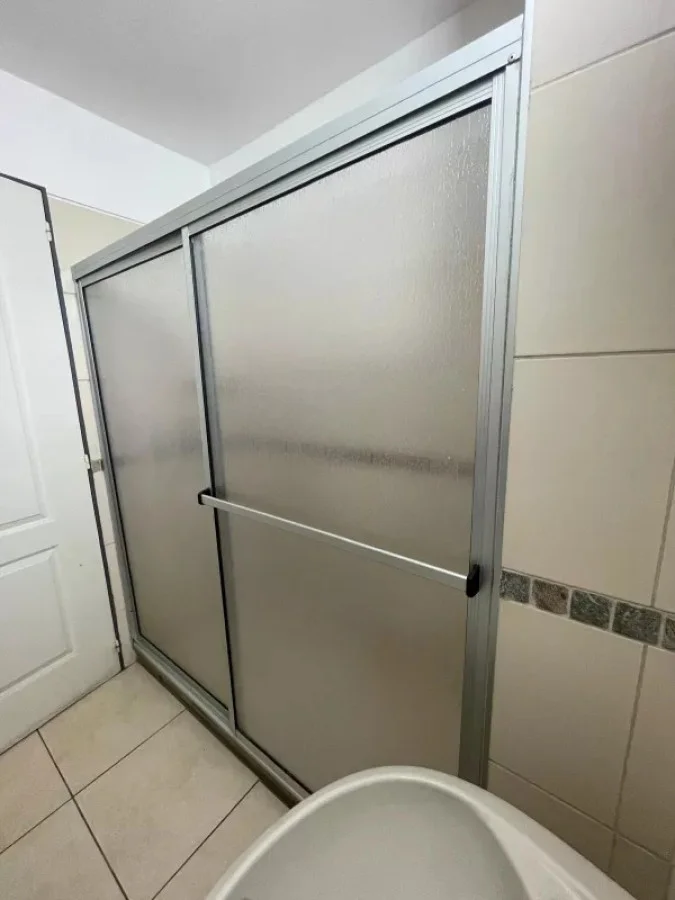 - Baño con mampara, mueble aéreo con llaves.