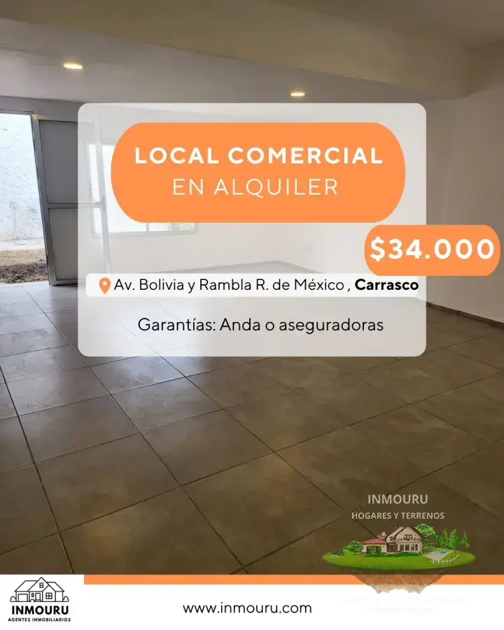 Se alquila local comercial en Carrasco, Av. Bolivia y la rambla 34m2 con baño. No apto para gastronomía Garantías: aseguradoras o Anda. Alquiler: $34.000 Honorarios profesionales: 1 mes de alquiler Agente Lorena Referencia Interna : Tera-1506