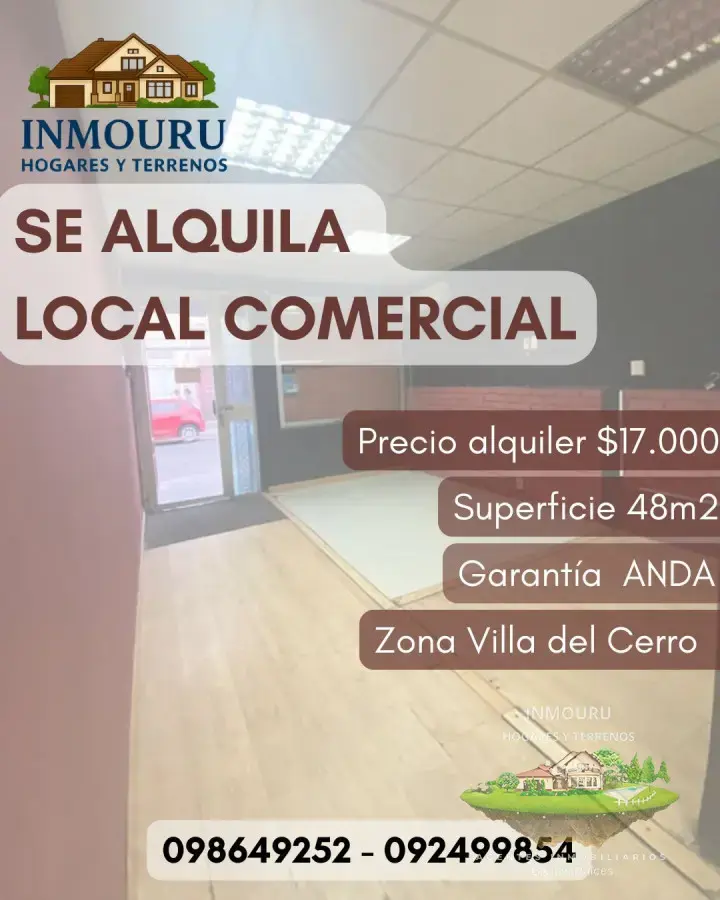 Se alquila local comercial en Villa del Cerro 48m2, aire acondicionado, lumínicas en el techo, baño con placar y extractor. Rejas y persianas metálicas A tres cuadras de la playa, paradas de ómnibus en puerta. Alquiler: $17.000 Honorarios profesionales: 1 mes de alquiler + IVA Agente Lorena Consulte (098) 649252 - (092)499854 Referencia Interna : Tera-998