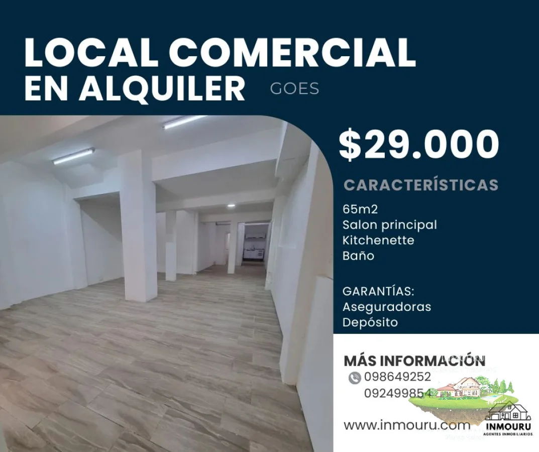 Se alquila local comercial en Goes, sobre José L. Terra Cuenta con 65m2 2 vidrieras Salón principal, kitchenette y baño Garantías: aseguradoras o depósito. Alquiler: $29.000 Honorarios profesionales 1 mes de alquiler + iva Agente Lorena Referencia Interna : Tera-1567