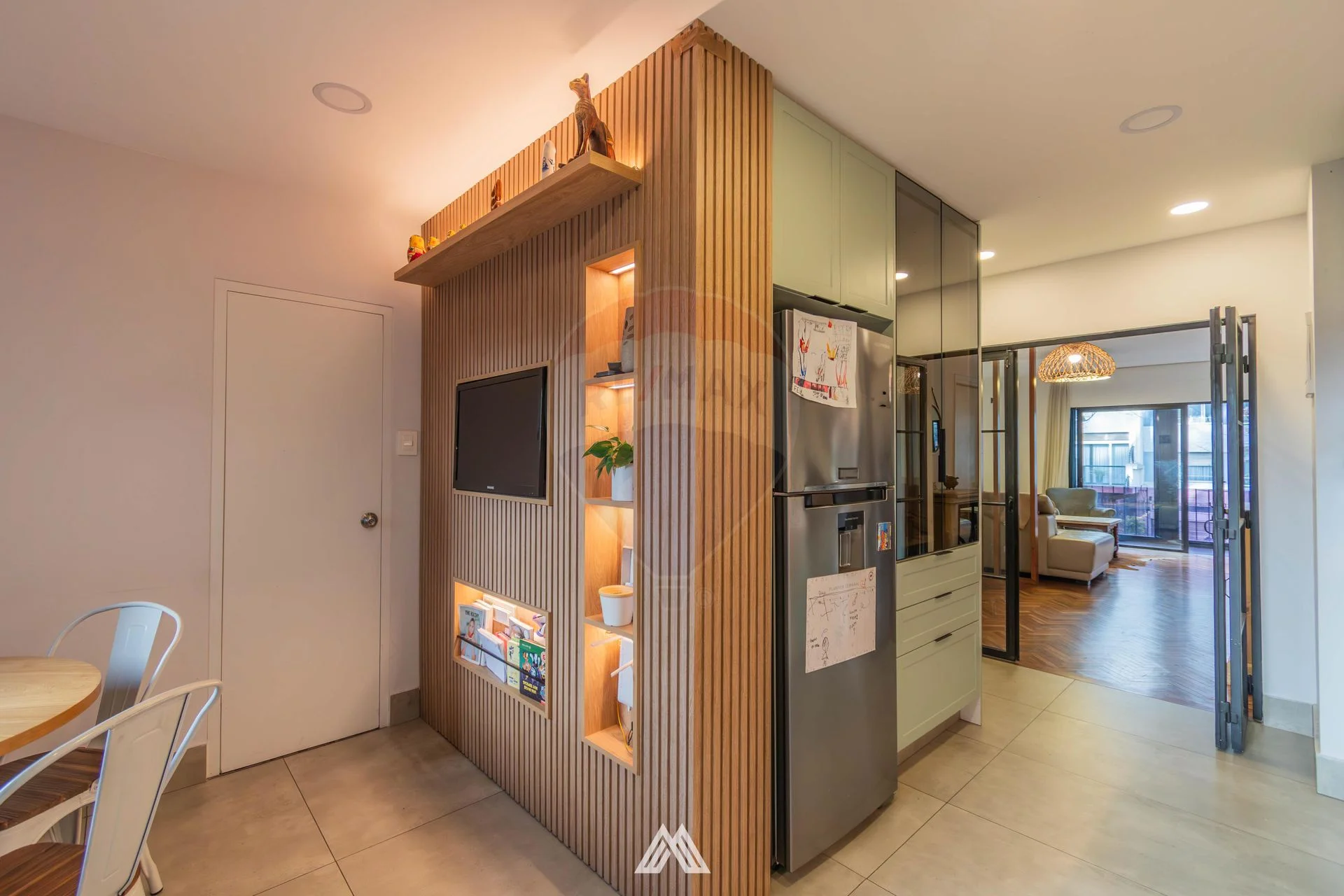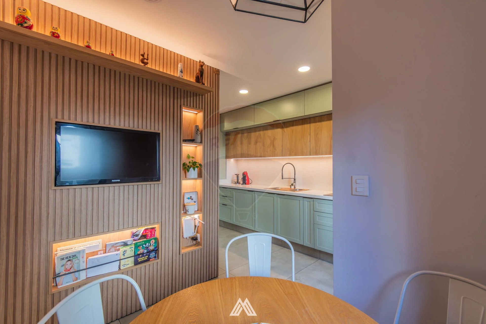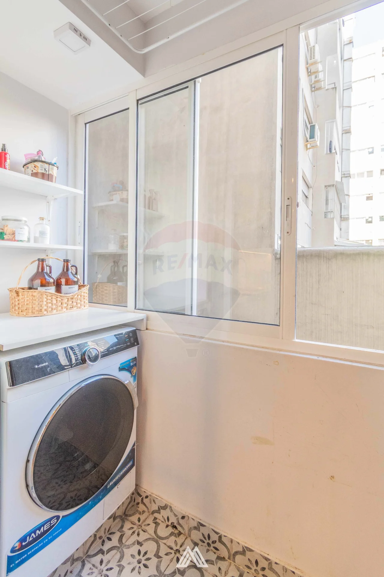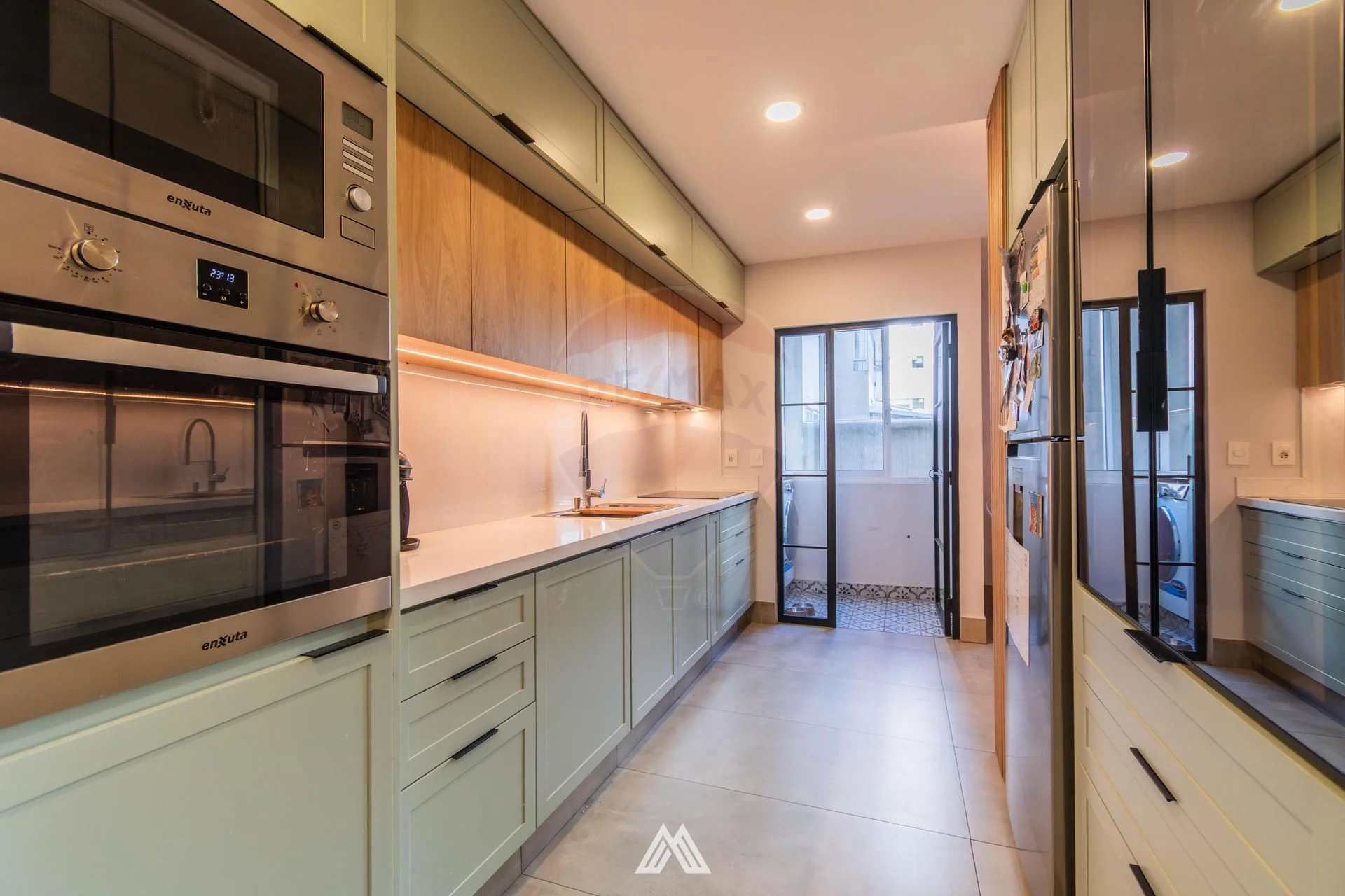 El living se conecta con la cocina comedor por una puerta venta de hierro y vidrio de tres hojas que le otorga amplitud y gran luminosidad a la unidad durante todo el día. La cocina cuenta con gran mesada de quarzo, muebles sobre y bajo mesada con gran espacio de almacenamiento, horno empotrado, anafe, campaña empotrada y microondas empotrado, comedor diario muy cómodo, con ventana al contrafrente, desde del que se accede al toilet. Terraza lavadero al contrafrente de muy buen tamaño con mueble empotrado y conexión para lavarropa. El área de la cocina comedor, toilet y terraza lavadero fue totalmente reciclada en 2023 con materiales de excelente calidad.