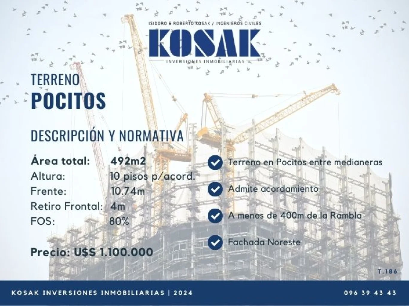 KOSAK INVERSIONES INMOBILIARIAS - TERRENOS De los pocos terrenos que quedan en Pocitos! Ubicado entre medianeras, admite acordamiento de 8 pisos. Fachada Noroeste. A tres cuadras de la Rambla. A media cuadra de 26 de Marzo. Próximo al Montevideo Shopping. Área total: 492m2 Altura: 8 pisos por acordamiento (6m normativos, mayor aprovechamiento) Frente: 10.74m Retiro Frontal: 4m FOS: 80% Por consultas comunicarse con Arq. Valentina Kosak - 096394343