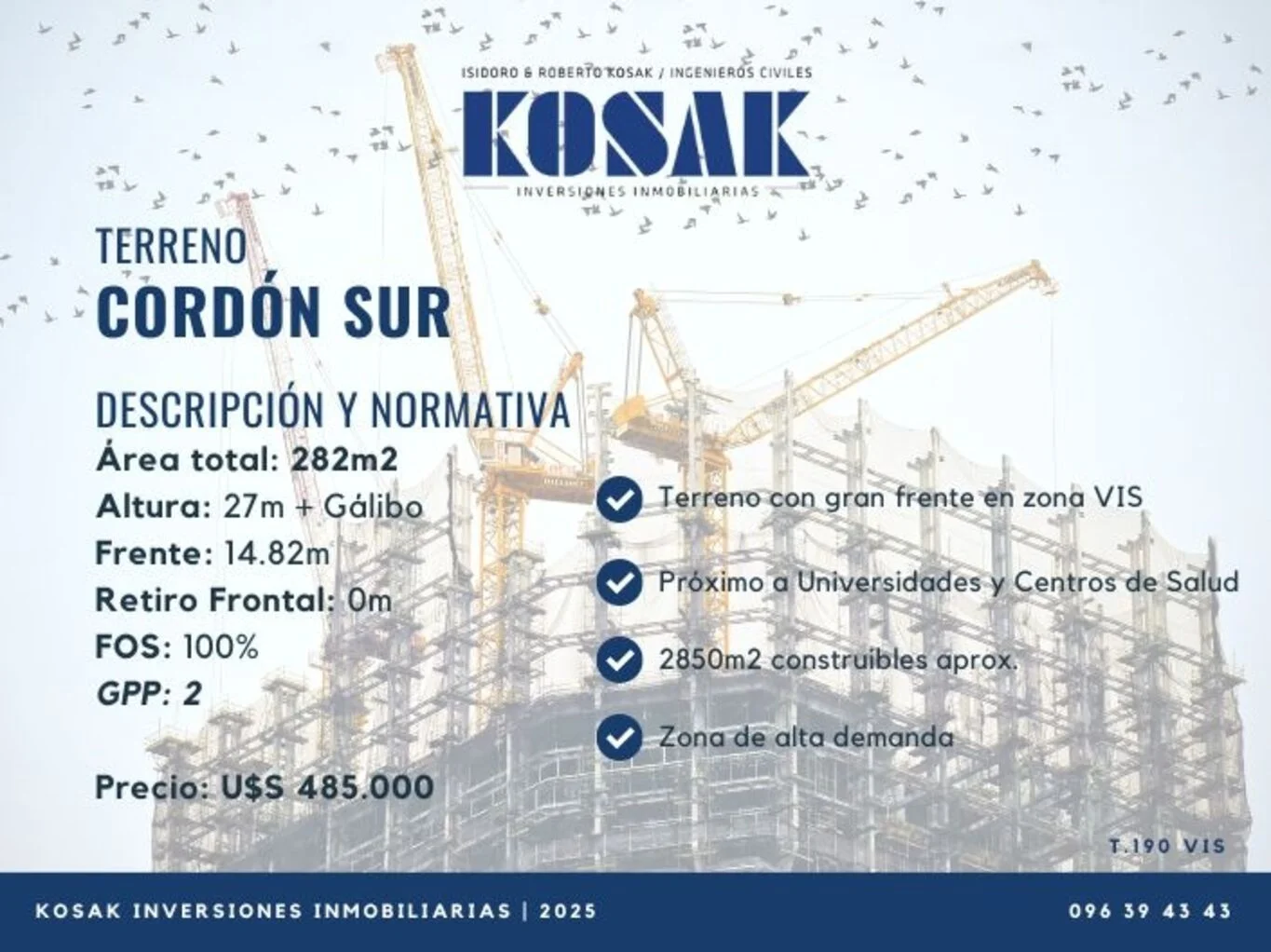 KOSAK INVERSIONES - TERRENOS Ideal terreno en excelente ubicación. A pasos de 18 de Julio, próximo a Br. Artigas, a metros de las universidades y con generoso frente. Área total: 282m2 Altura: 27m + Gálibo Frente: 14.82m Retiro frontal: 0m FOS: 100% GPP 2 / CUP 18 de Julio Edificabilidad aprox.: 2850m2 construibles aproximadamente. Precio: U$S 485.000 (acepta canje próximo a estrenarse) Por consultas comunicarse con Arq. Valentina Kosak - 096394343
