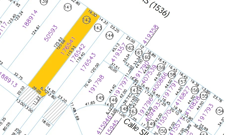 Frente de 19.30 metros por calle Islas Canarias, 125.53 metros de largo. Terreno de 2510 m2 totales.