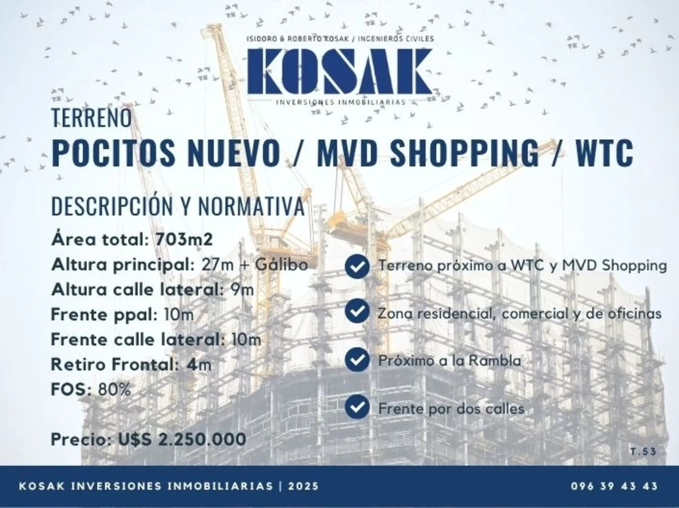 KOSAK INVERSIONES INMOBILIARIAS - TERRENOS Terrenos con frente por dos calles. Próximo a Montevideo Shopping, a WTC, a la Rambla. Con altura sobre la calle principal y bajo en la calle lateral, más barrial. En inmejorable punto de la ciudad. Zona de residencias, locales comerciales, oficinas y consultorios. Área total: 751m2 (303 + 448) Altura principal: 27m + Gálibo Altura calle lateral: 9m Retiro Frontal: 4m FOS: 80% Frente: 10m por ambas calles Por consultas comunicarse con la Arq. Valentina Kosak - 096394343