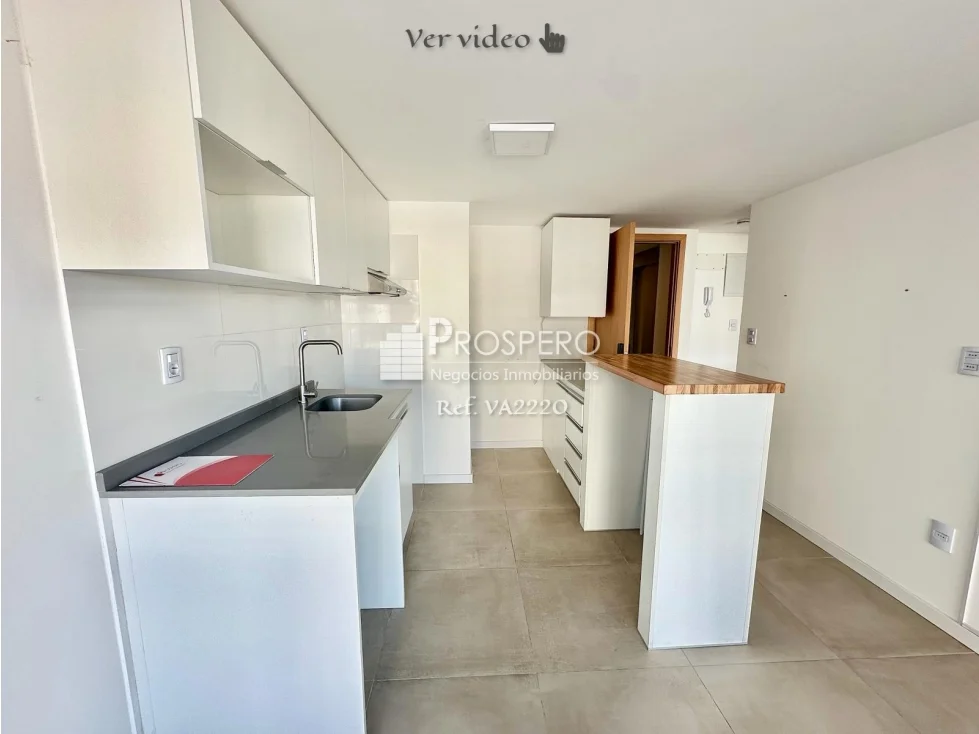 Living-comedor con un gran ventanal hermoso y salida a terraza con parrillero, cocina integrada con muebles aéreos y bajo mesada, además de contar con campana extractora.