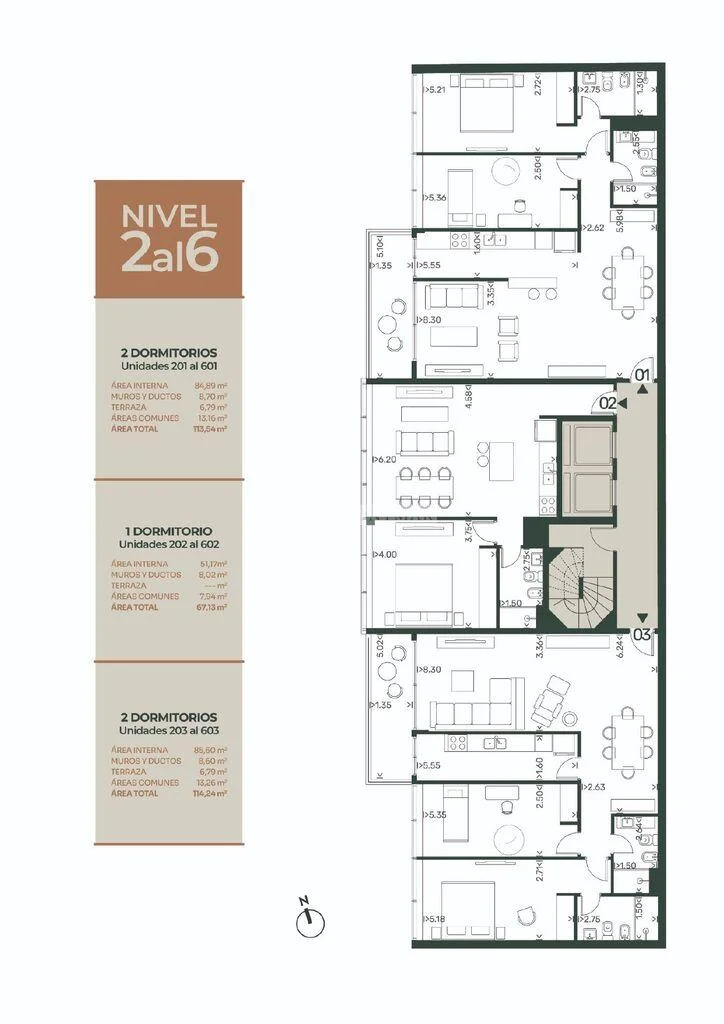 203 a 603) 94,2m área propia + 13,26m área común + 6,79m terraza = 114,24m totales