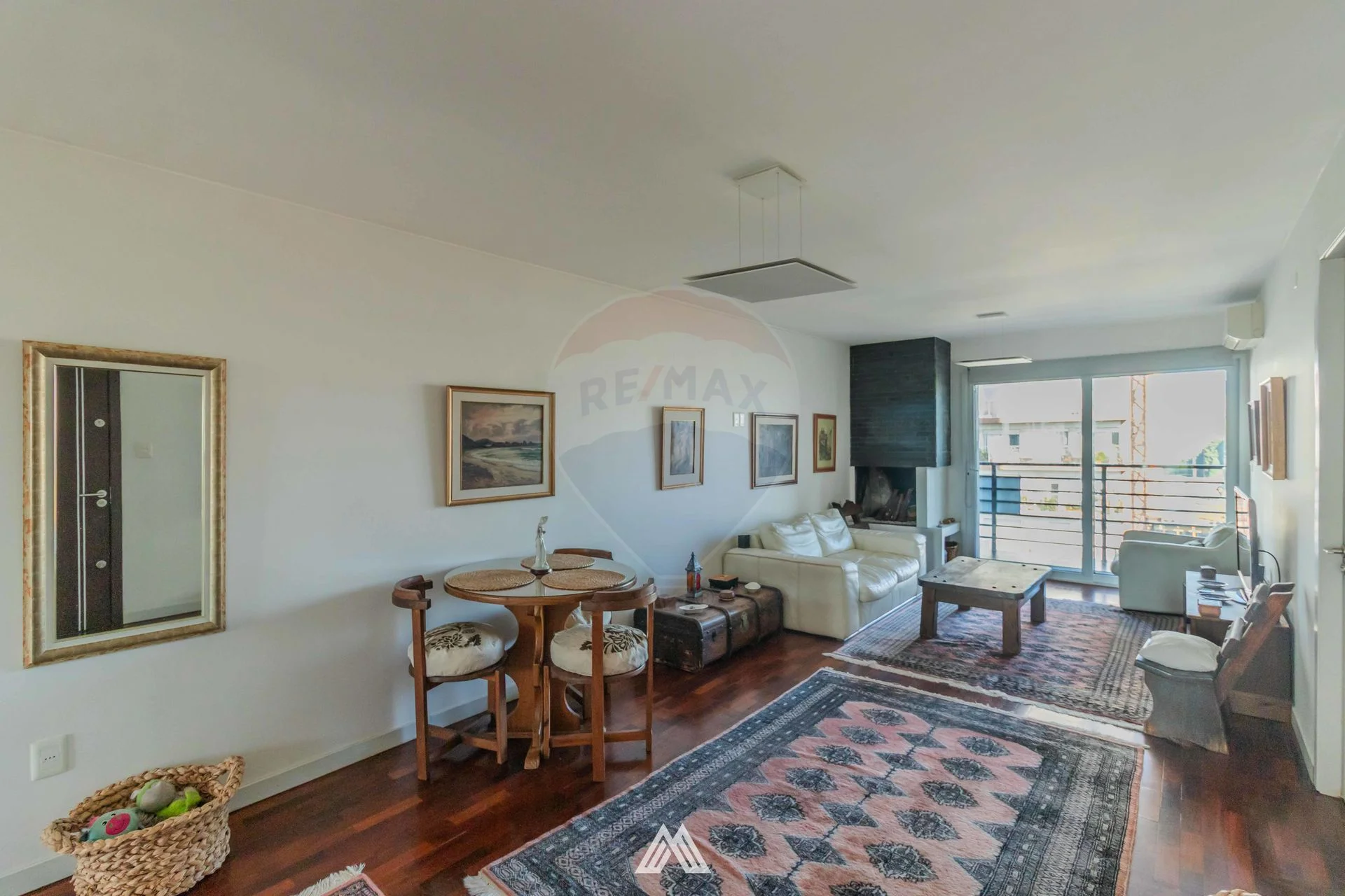 Amplio Living comedor con estufa a leña y salida a terraza .