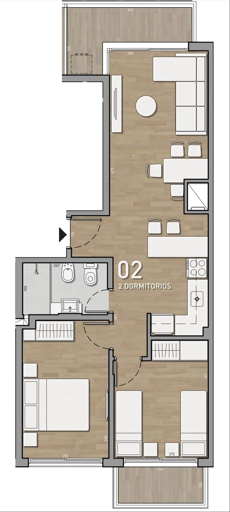 Living comedor con terraza orientación norte. Agradable cocina Integrada con amplios placares sobre y bajo mesada. 2 dormitorios con placares, el principal con terraza. Doble orientación Norte-Sur. Vistas al mar. Baño completo.