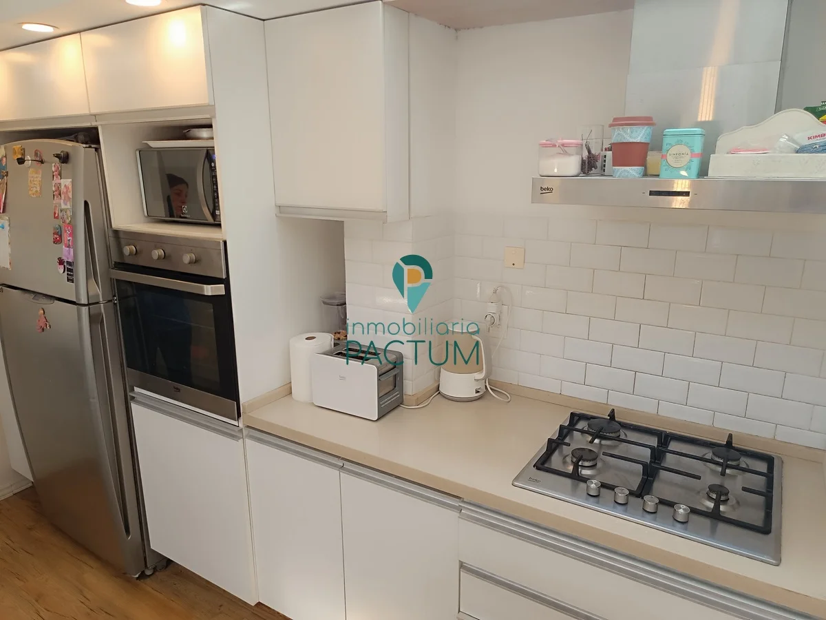 Cocina con placares aéreos y bajo mesada, anafe, horno empotrado y aire acondicionado.