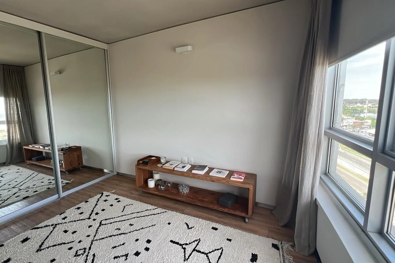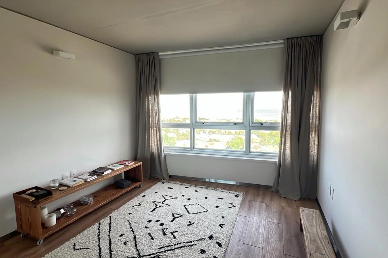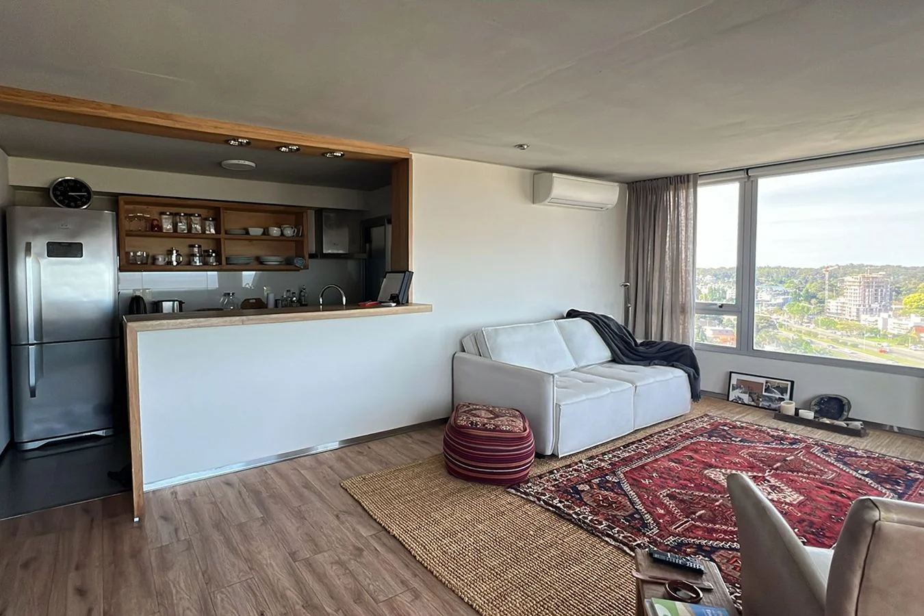 Amplio living comedor, grandes ventanales y salida a una terraza con vista despejada. Moderna cocina equipada con línea blanca completa: heladera, horno, anafe, campana, lavadora, secadora y terraza de servicio. Dos dormitorios de generosas dimensiones, principal con vestidor y baño en suite. Incluye rollers automáticos, cortinas y aire acondicionado en living y dormitorios. Garaje doble incluido en el precio.