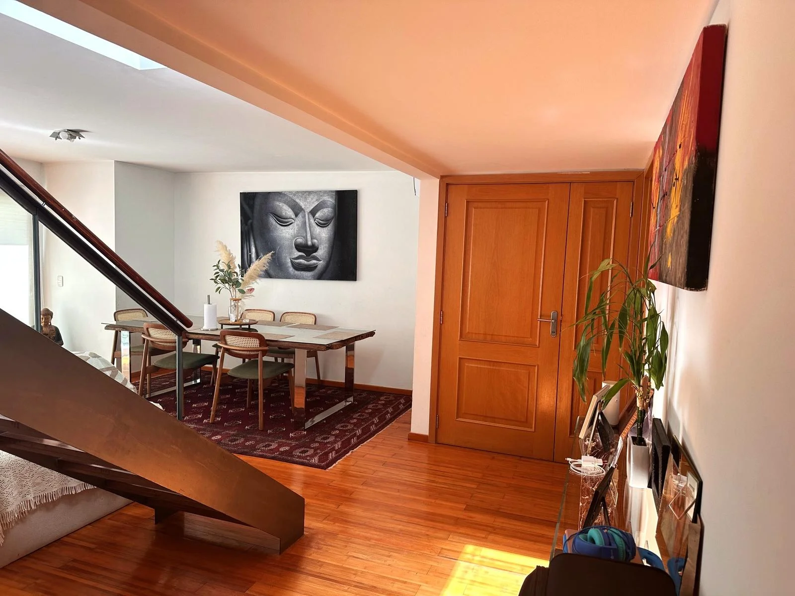 En planta principal , entrada a living comedor apaisado orientado al norte con estufa a leña, vidriado de piso a techo y con salida por amplios ventanales a terraza amplia y cuadrada.