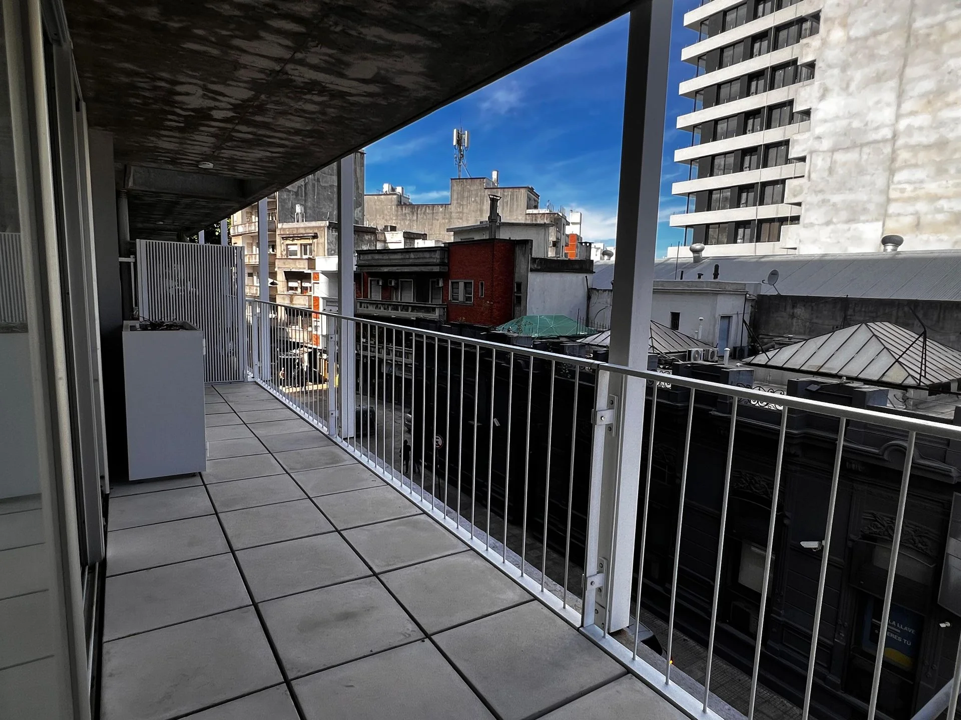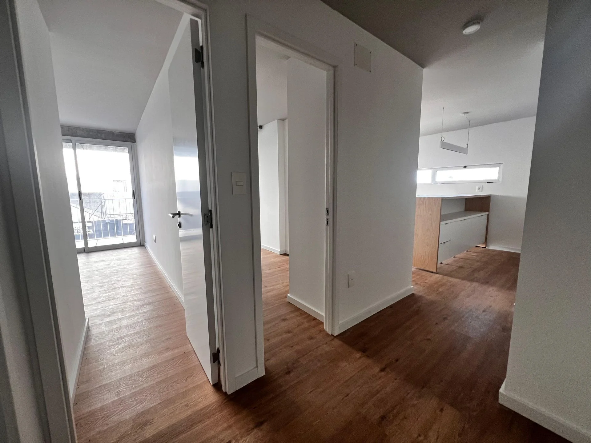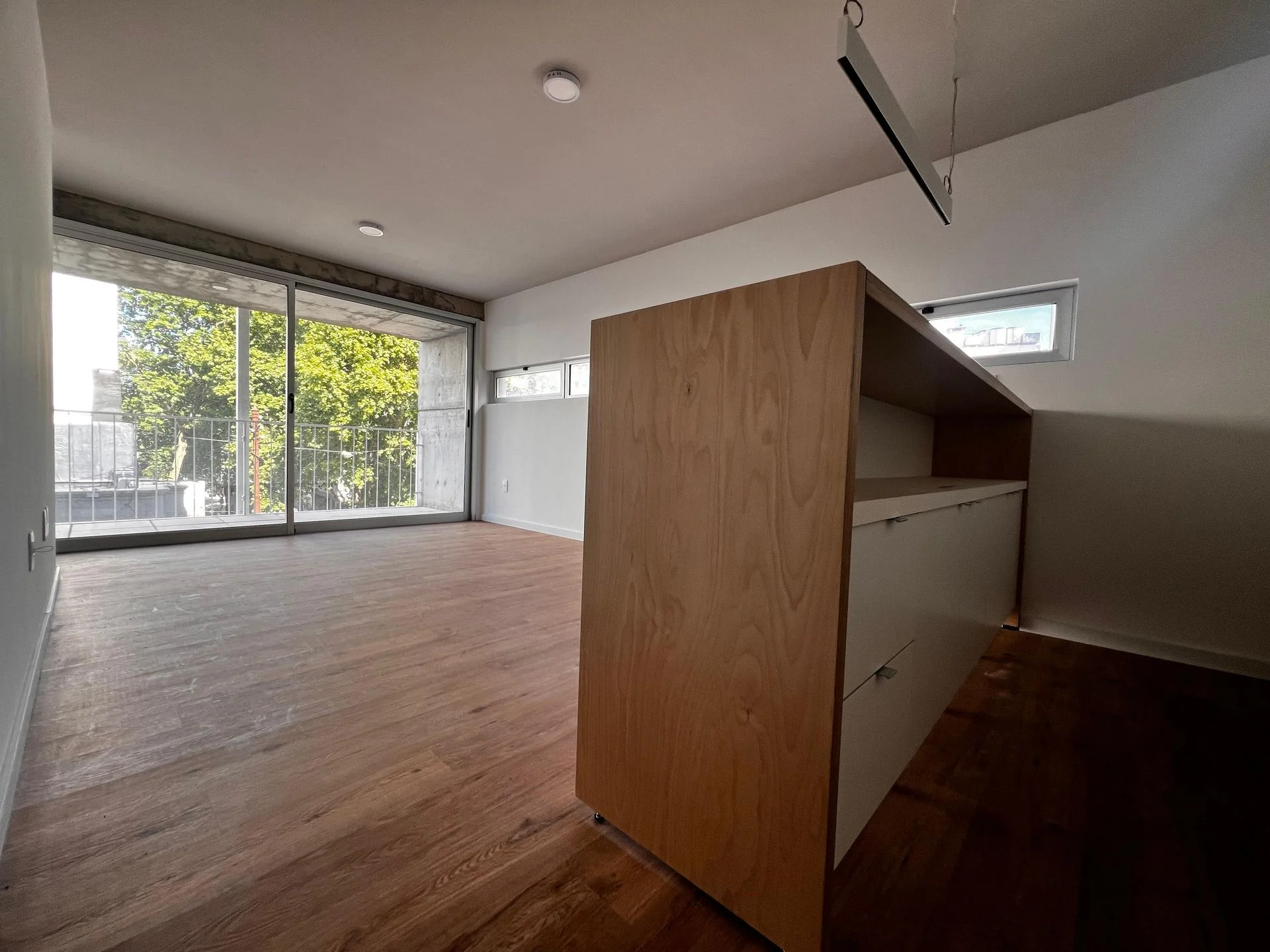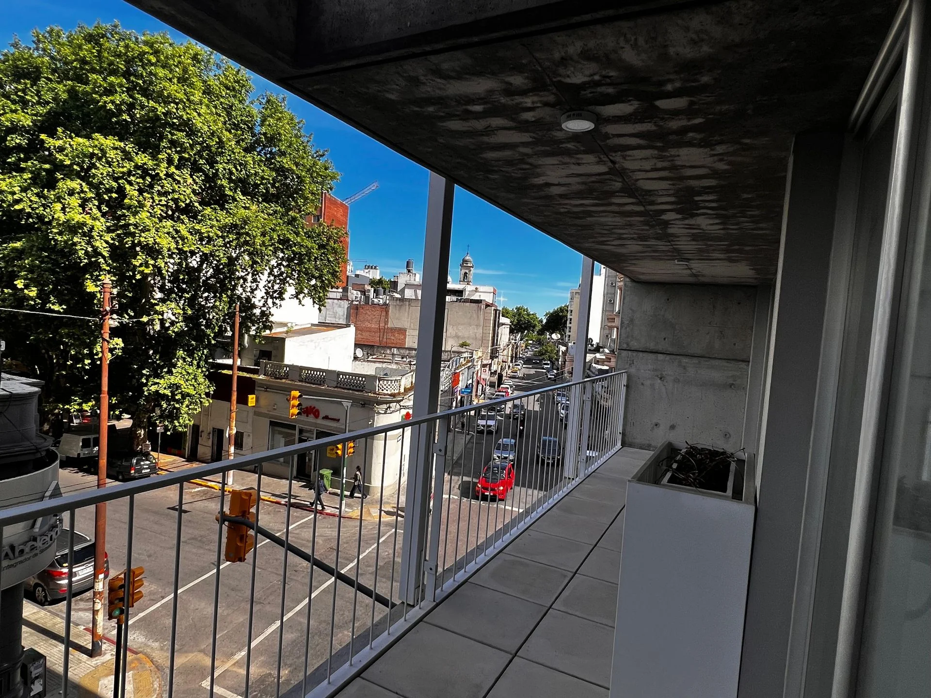 Luminoso living-comedor con amplia terraza al frente, cocina semiintegrada con barra, dos dormitorios con placares empotrados y baño completo con mampara.