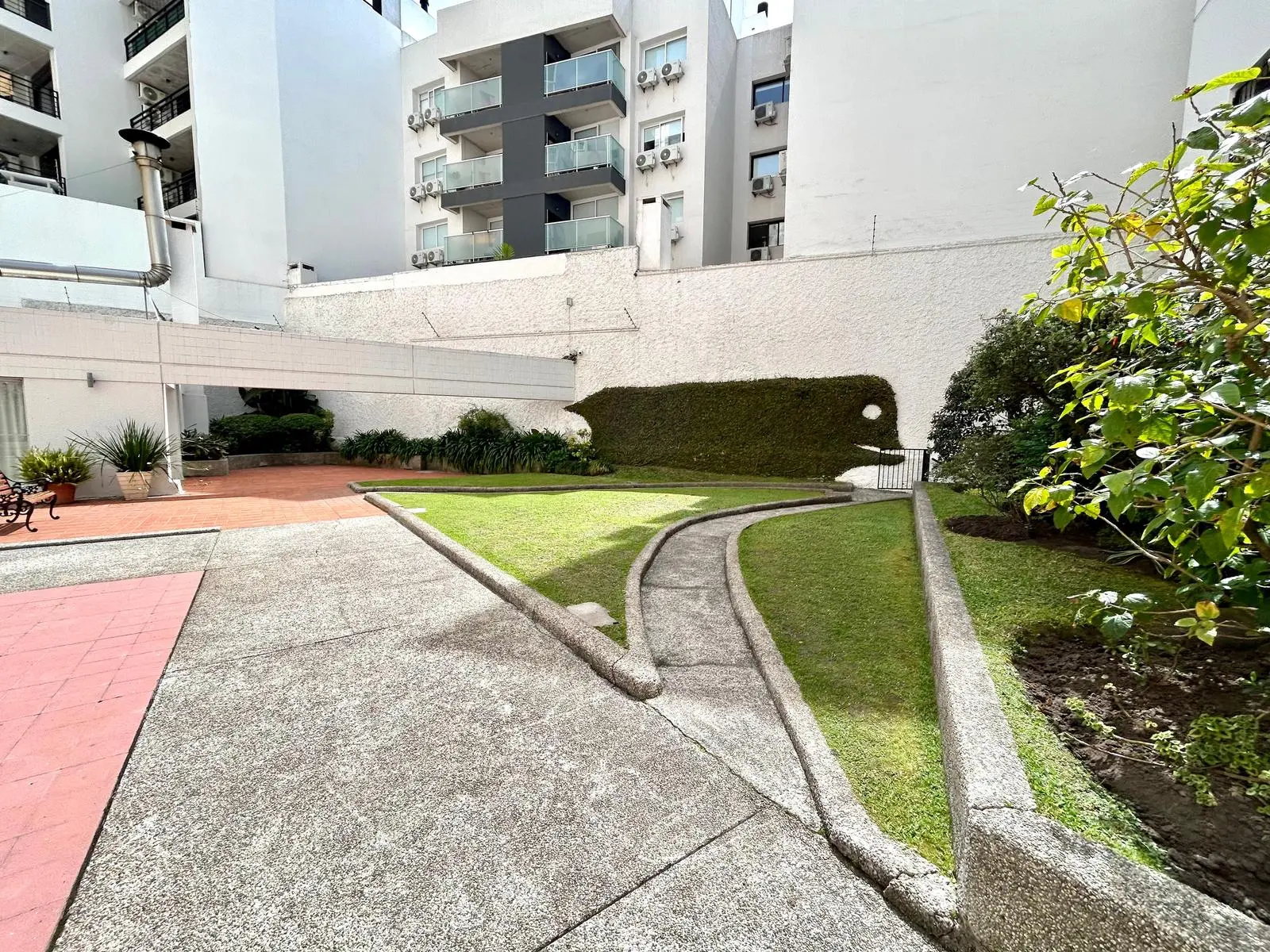 Amplio patio con áreas verdes.