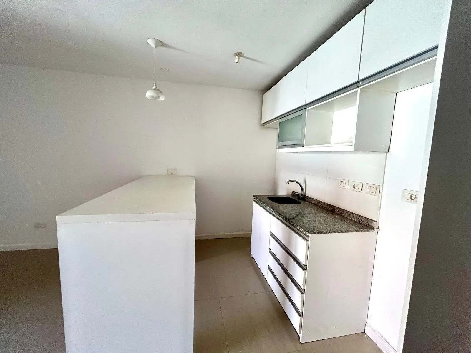 Cocina comedor con barra desayunadora, muebles bajos y sobre mesada. Conexión para lavarropas