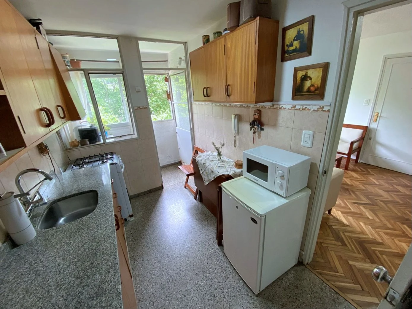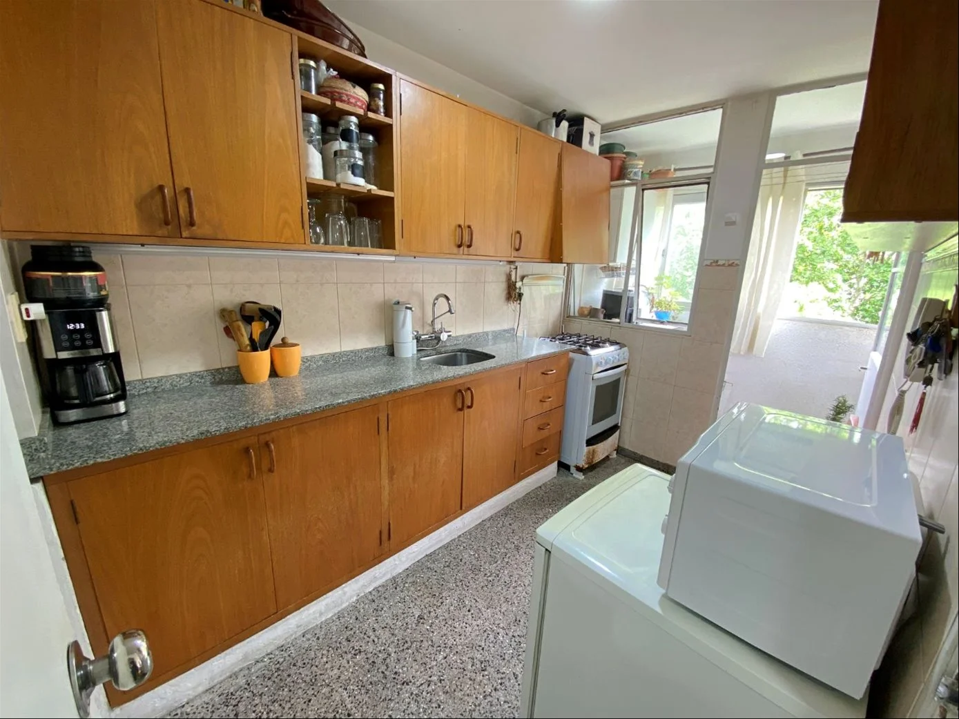 • Cocina definida con muebles aéreos y bajo mesada de madera, con salida a la terraza lavadero.