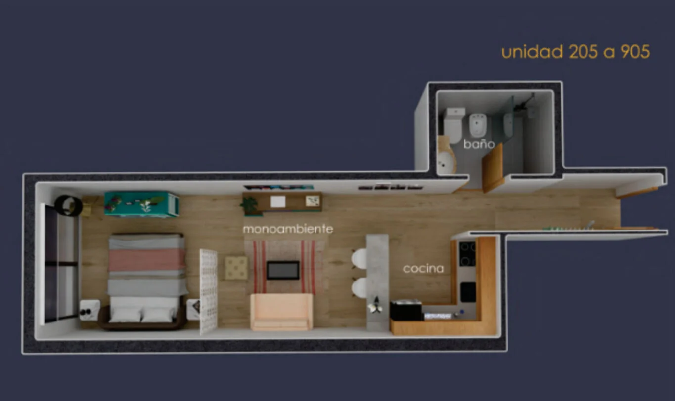 Diseño y confort: El proyecto se construye bajo el concepto de solidez y funcionalidad, con unidades monoambiente y de 1 dormitorio desarrolladas en construcción tradicional. Ambientes amplios, bien distribuidos y pensados para maximizar la luz natural y el confort.