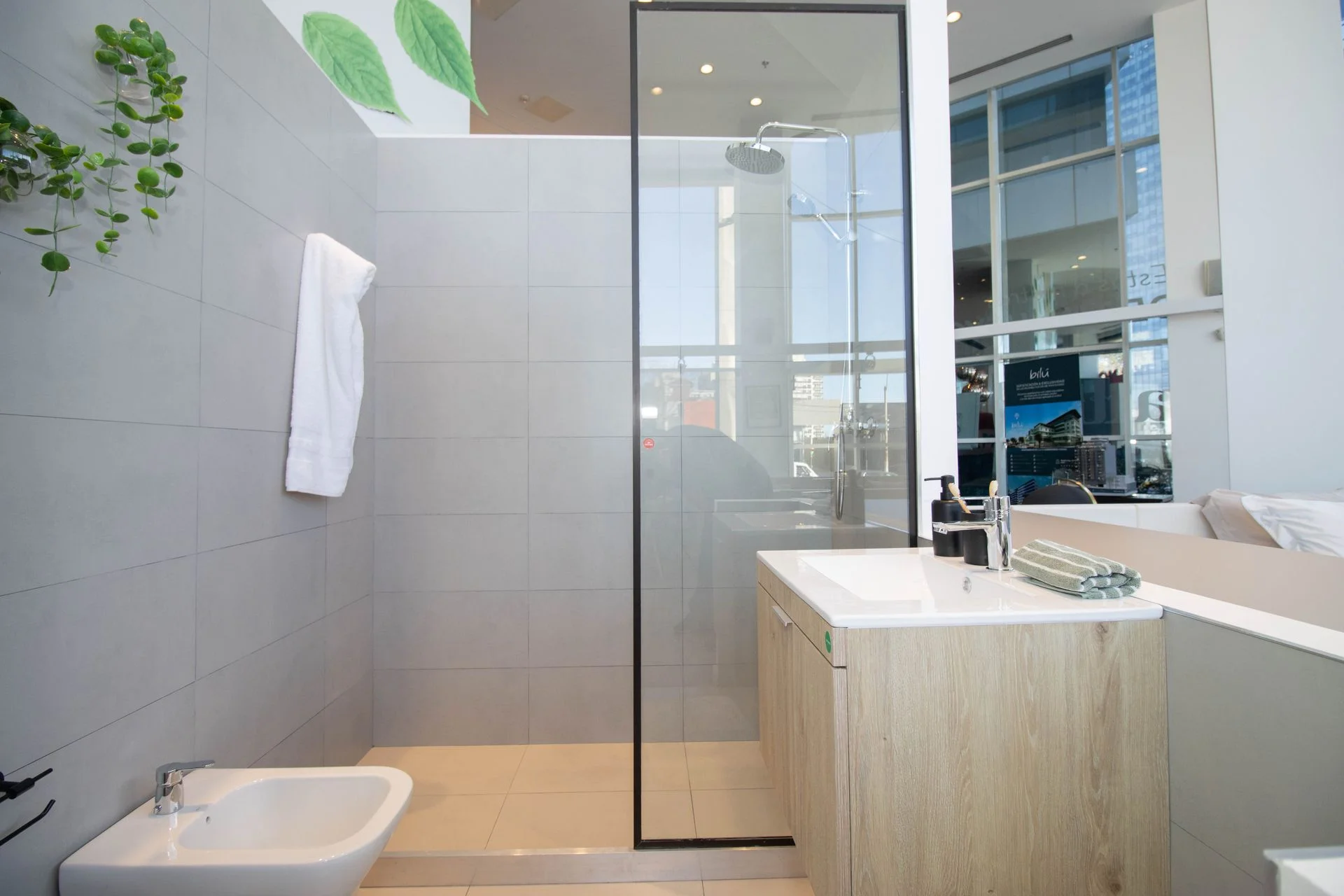 * Baño elegante con porcelanato, cerámicos claros, equipamiento sanitario blanco, griferia