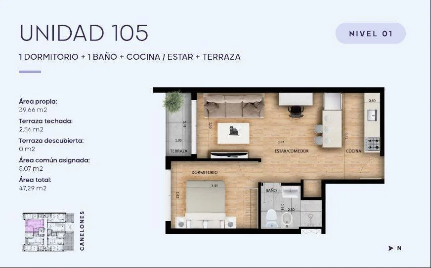 CASASWEB(239182) Proyecto: Noveau SohoDirección: Canelones 1566 y 1570 entre Salto y Lorenzo CarnelliFecha de entrega: Marzo 2026Desarrollista: Tap construccionesUnidad: 105En planta baja se ubican la cafetería, el espacio co work, SSHH y el loundry.En el nivel 1 ubicamos el playroom de jóvenes y adultos.Con vista panorámica a la ciudad, en el nivel 11 encontramos algunos de los amenities principales para el esparcimiento y realización de reuniones sociales como son; el salón de usos múltiples con parrillero y completamente equipado, un parrillero abierto de grandes dimensiones, un espacioso solárium con orientación norte recibiendo el sol durante todo el año y durante todo el día, gimnasio cerrado y abierto y servicios higiénicos para comodidad de todas las instalaciones.El proyecto se desarrolla con un total de 13 plantas que fueron especialmente diseñadas para ser aprovechadas y disfrutadas de la mejor manera y al estilo de vida urbano actual de la zona donde se encuentra emplazadoGarages disponibles desde USD 15.120Conexiones 4%Honorarios inmobiliarios: 3% + IVA Ver mas detalles en casasweb.com?239182