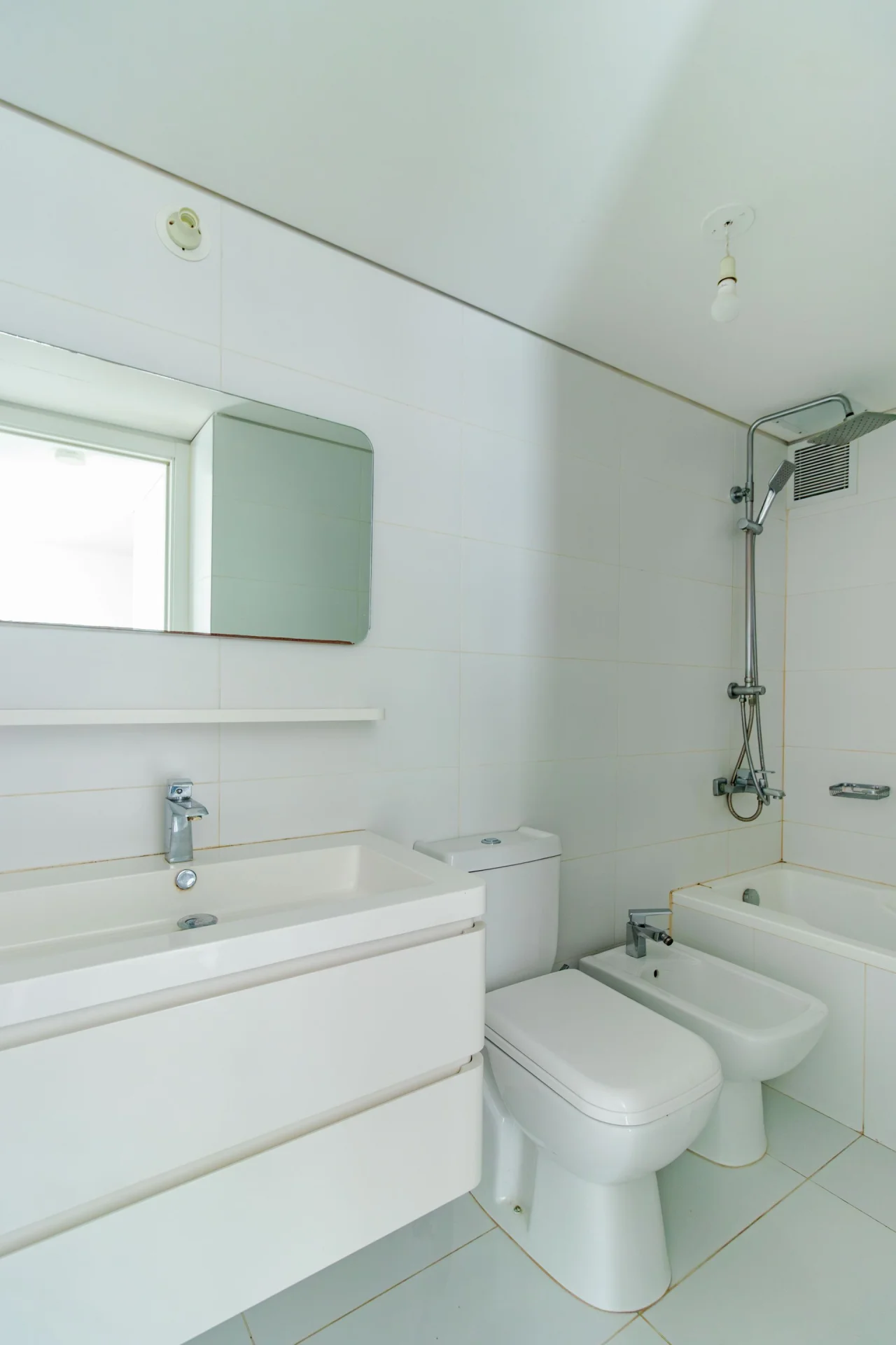 Baño con artefactos sanitarios cerámicos blancos, grifería cromada, vanitory y espejo.