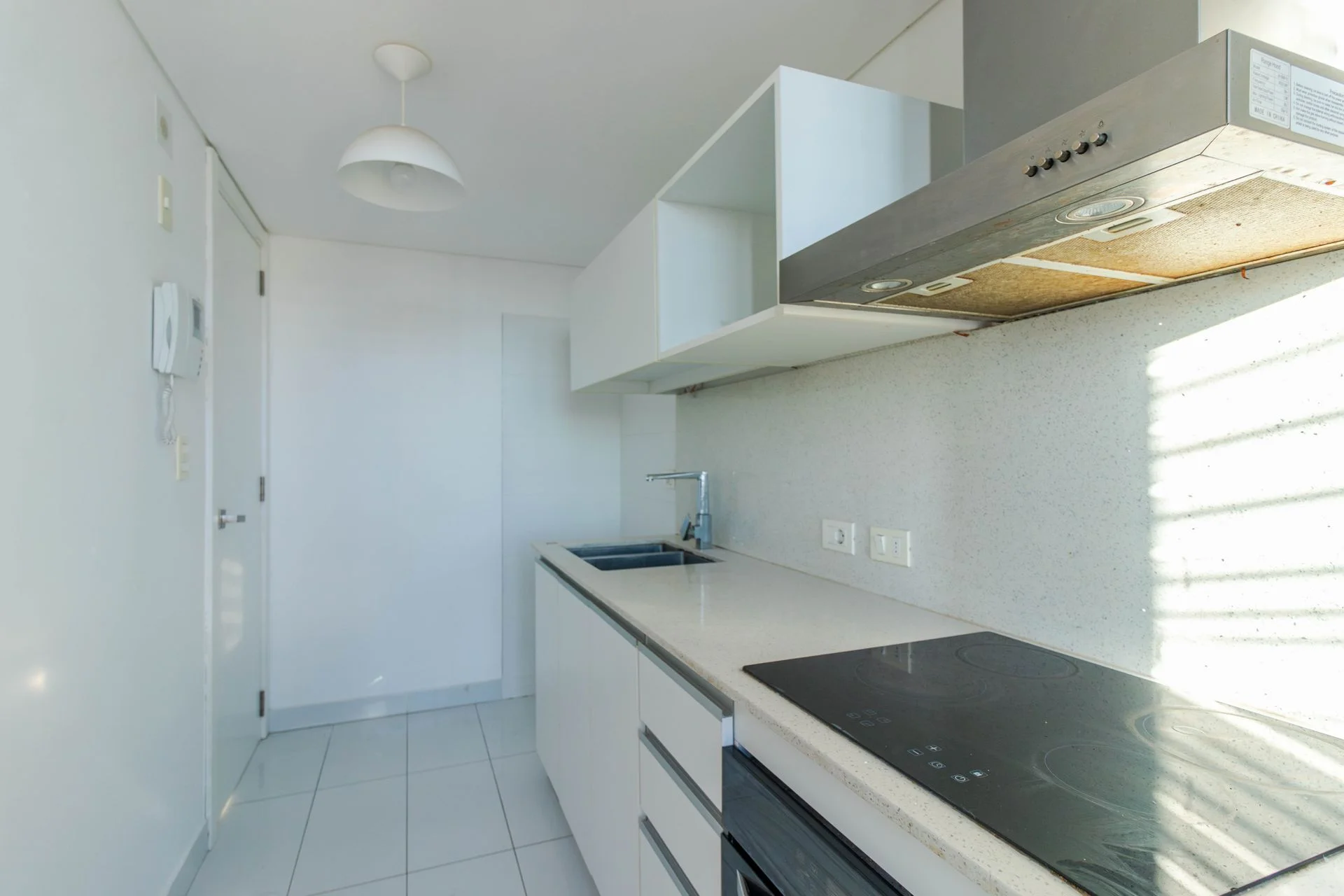 Cocina equipada con horno eléctrico, anafe de inducción, campana empotrada y pileta de acero inoxidable.