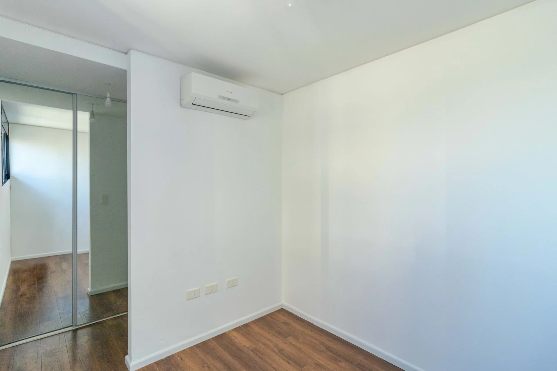 Dormitorio con placard espejado e interiores en melamina blanca.