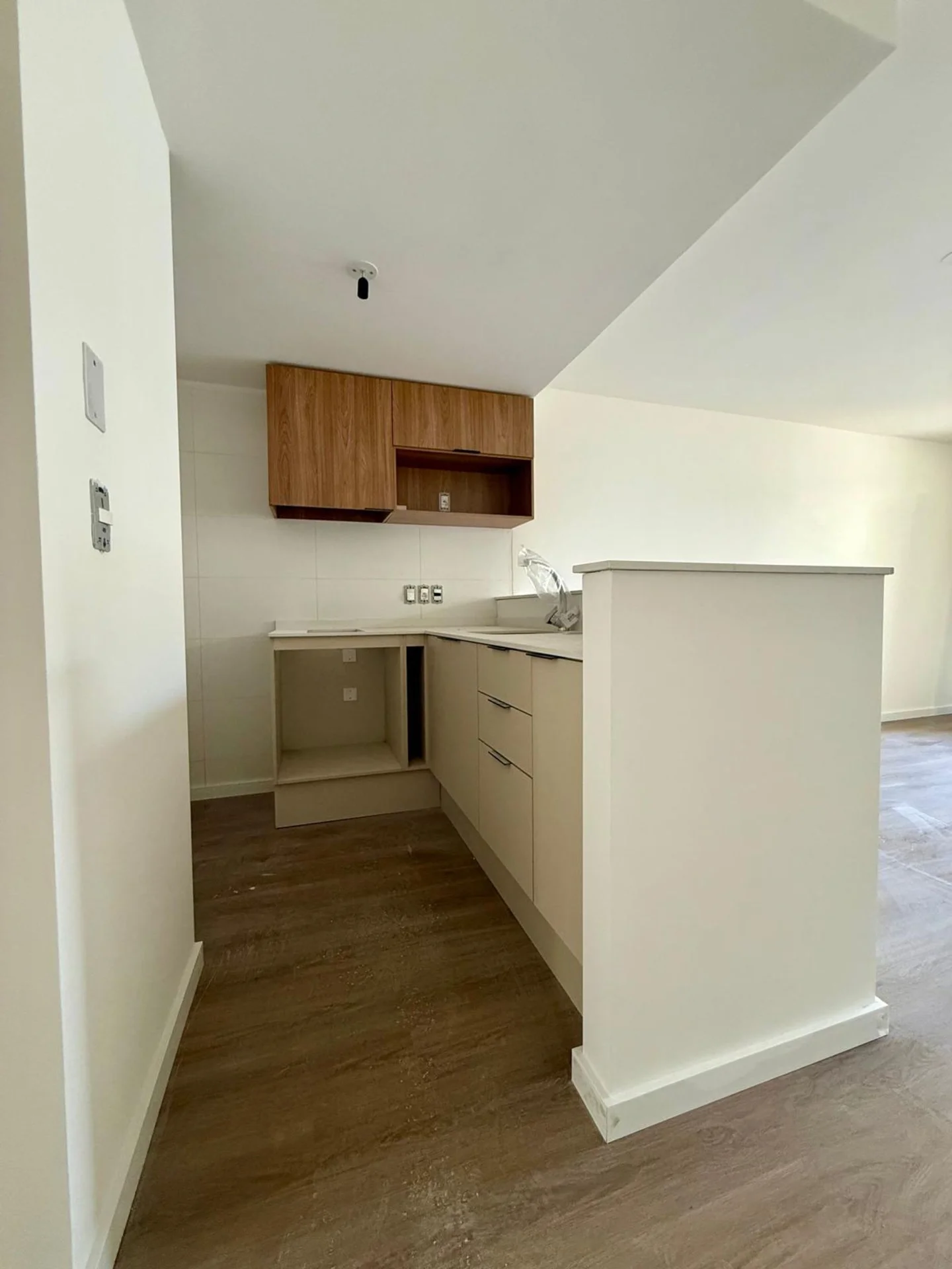 La cocina es integrada y se entrega con mueble sobre y bajo mesada. Cuenta con un mueble para colocación de lavarropas en la cocina.