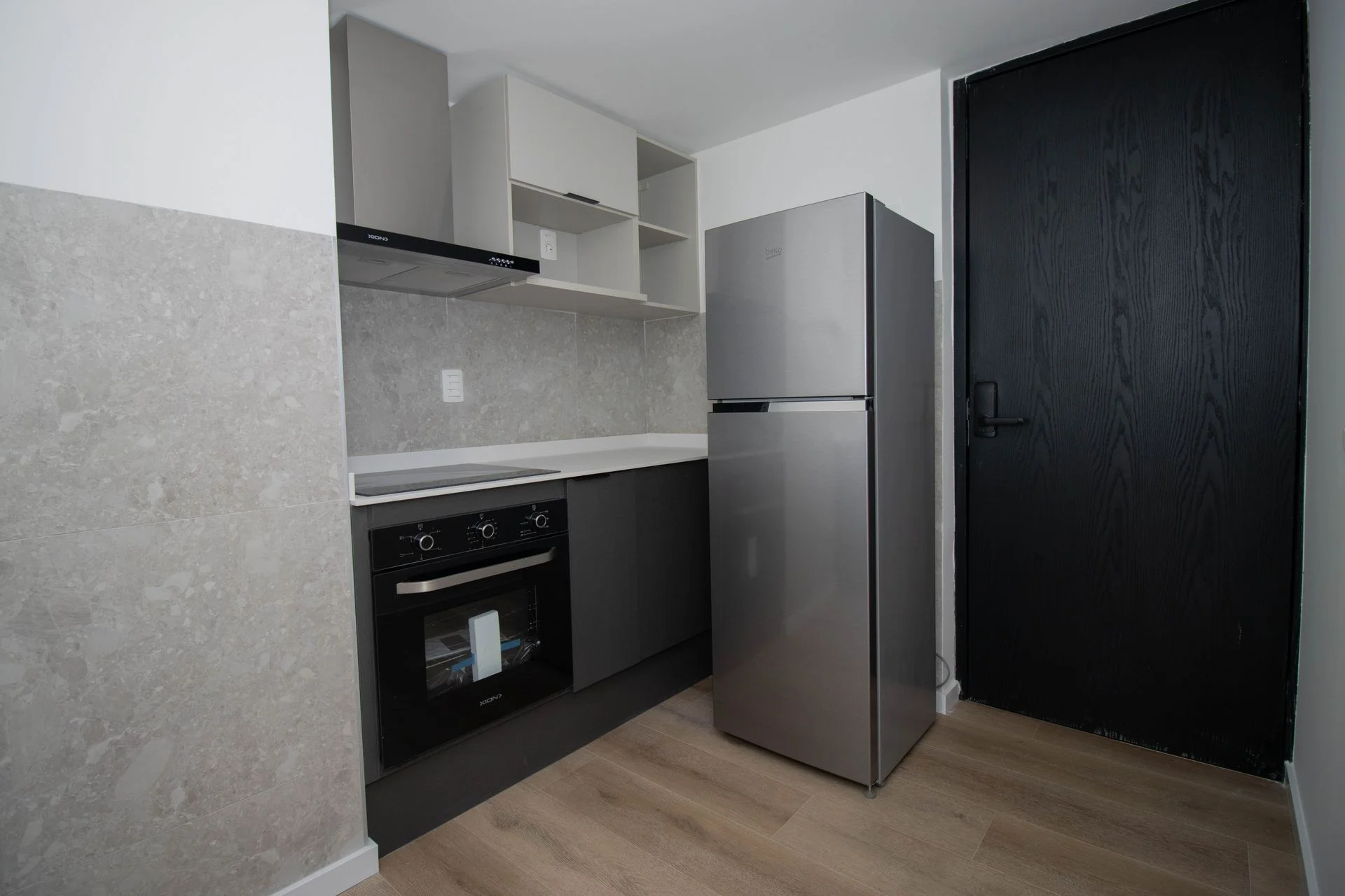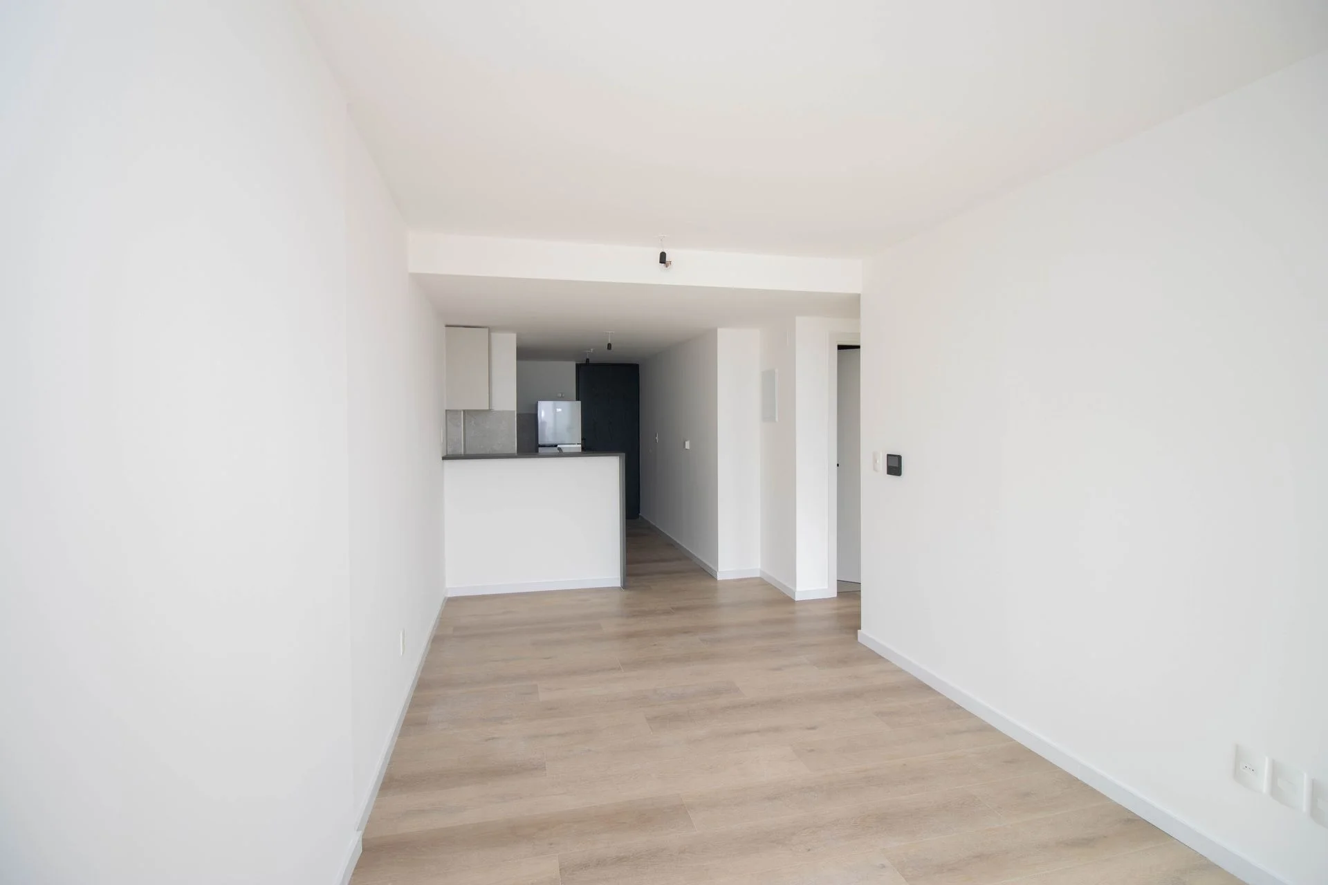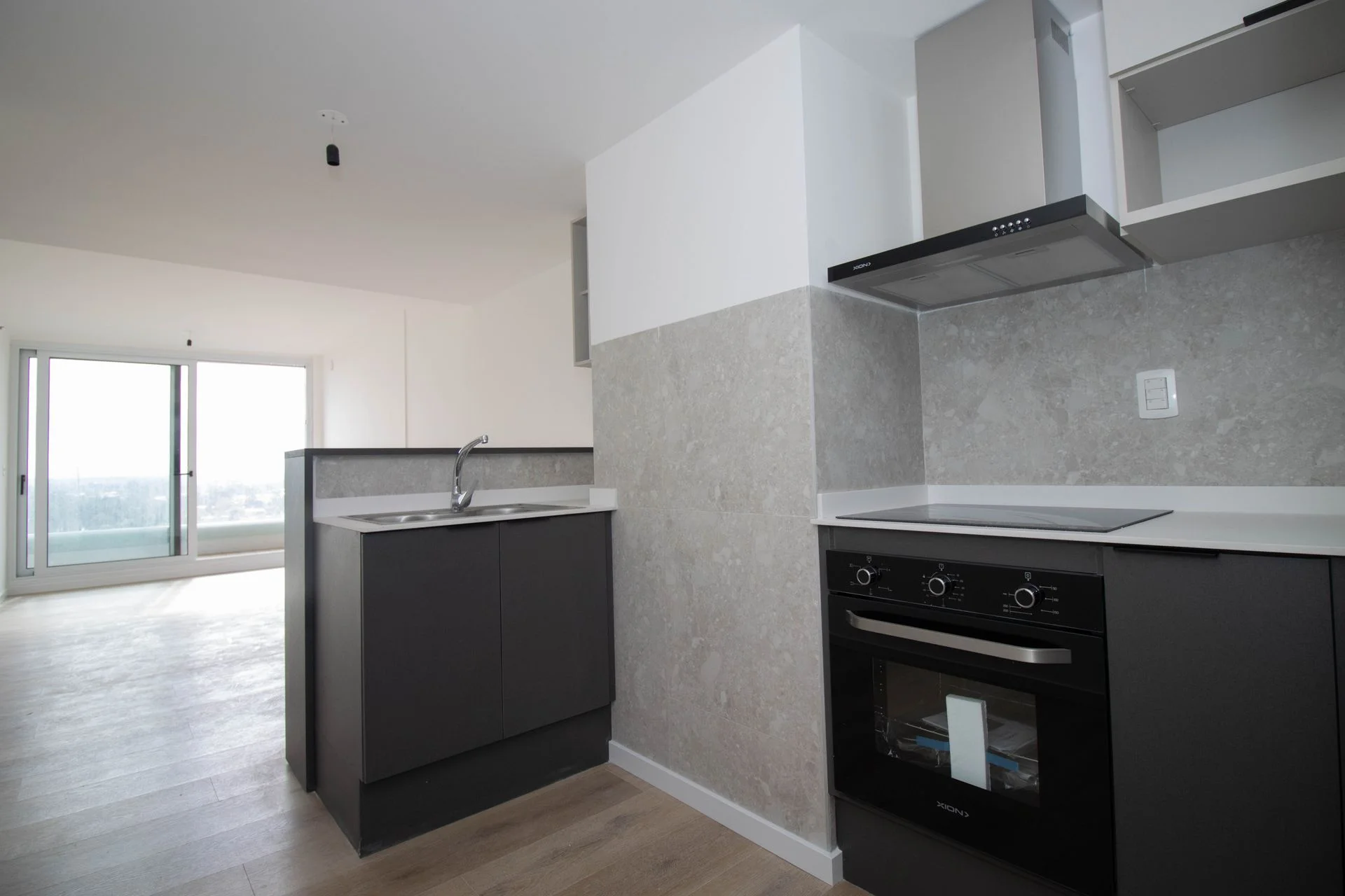 Al ingresar accedemos al living con cocina integrada de forma armónica y separada mediante una barra/mesada bien práctica. La cocina cuenta con horno anafe empotrado, campana de extracción, heladera y muebles aéreos y bajo mesada.