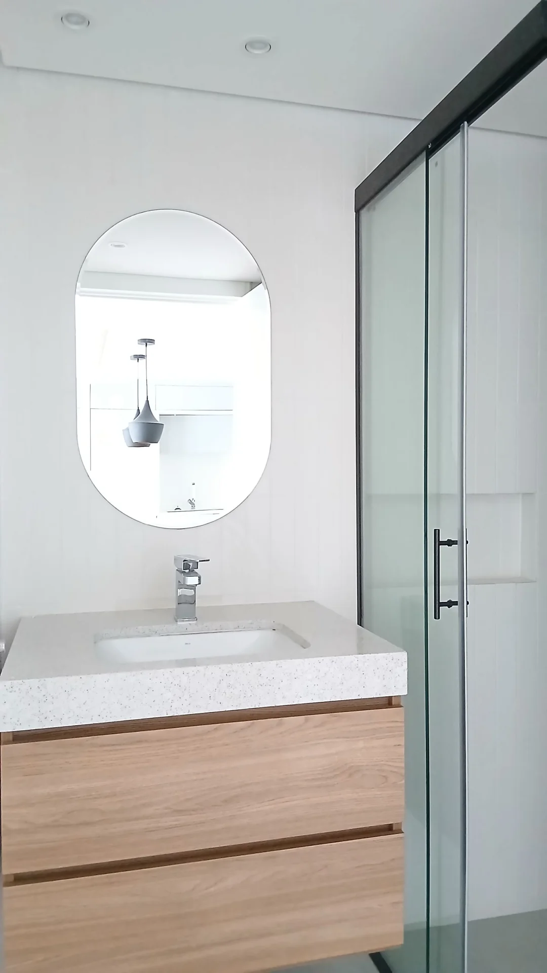 Baños: artefactos sanitarios cerámicos blancos, griferías y accesorios cromados, vanitory con cajones simil madera, mampara de ducha, espejo, pisos en porcelanato gris claro y revestimiento cerámico subway blanco.