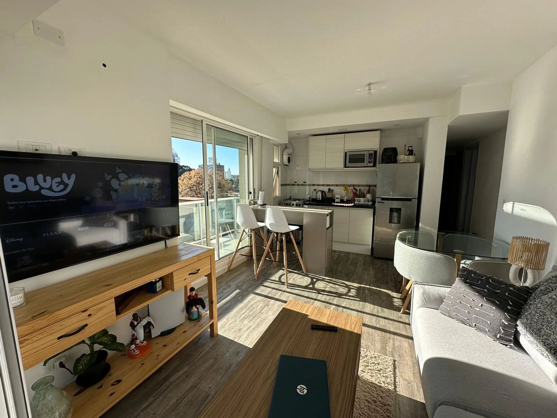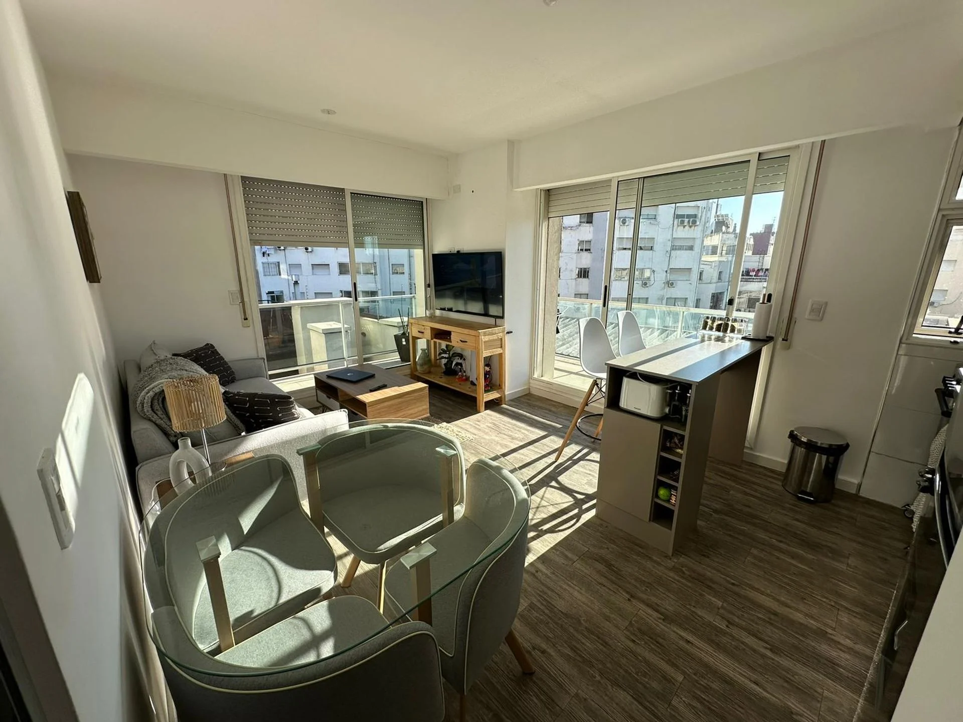 Living comedor con dos terrazas: una al contrafrente y otra lateral con parrillero.