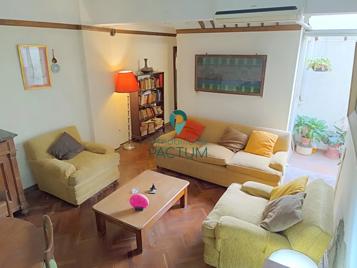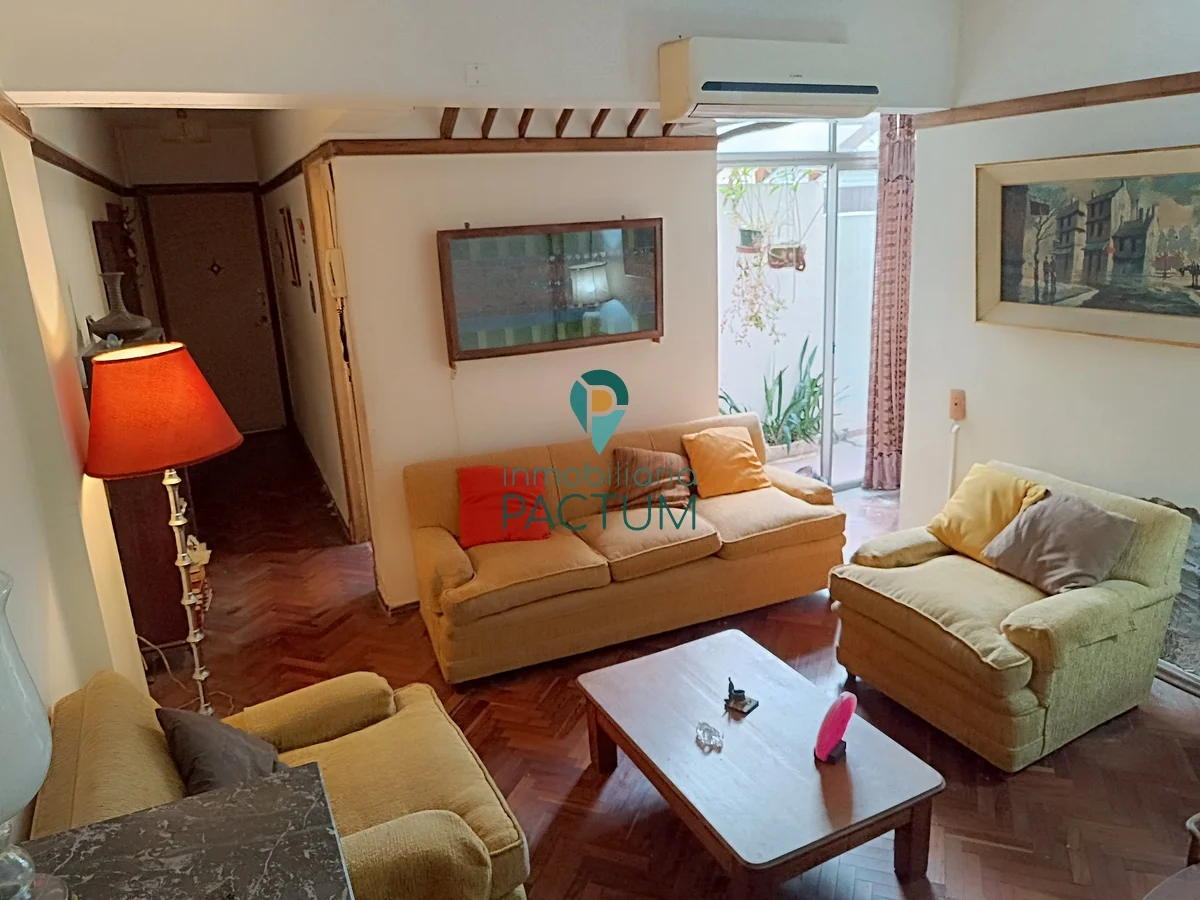 Living comedor de buen tamaño, con piso de parquet, aire acondicionado y acceso al patio.