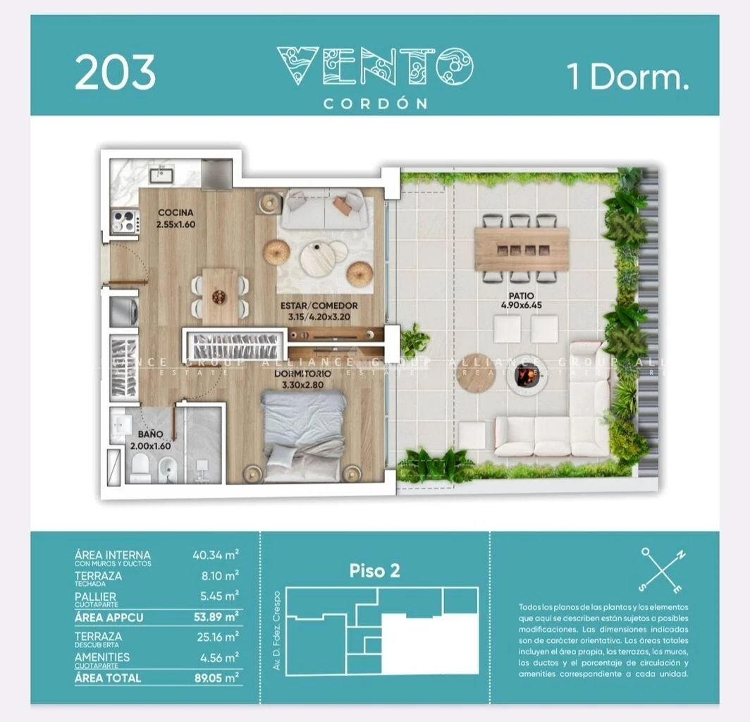 40,34m2 área propia c/muros + 8,10m2 terraza techada + 25,16m2 terraza descubierta + cuotaparte de pallier & amenities = 89,05m2 totales.