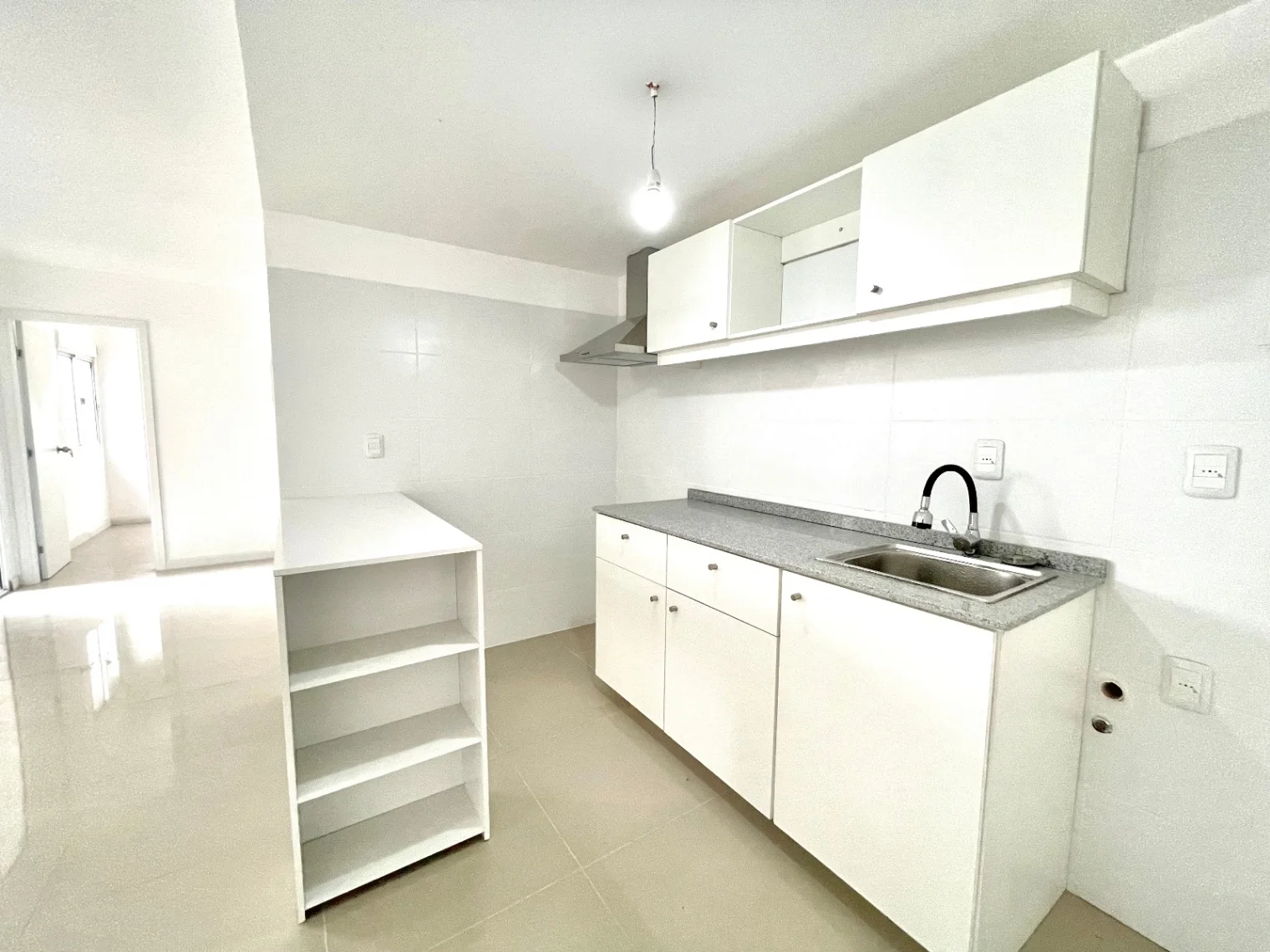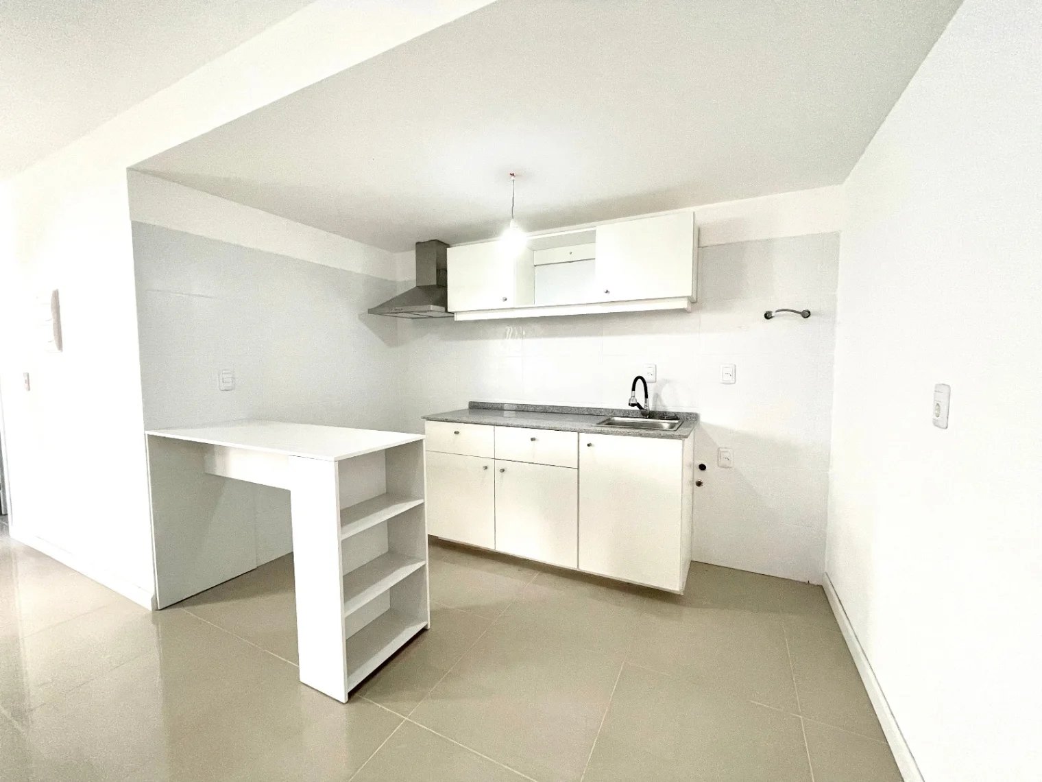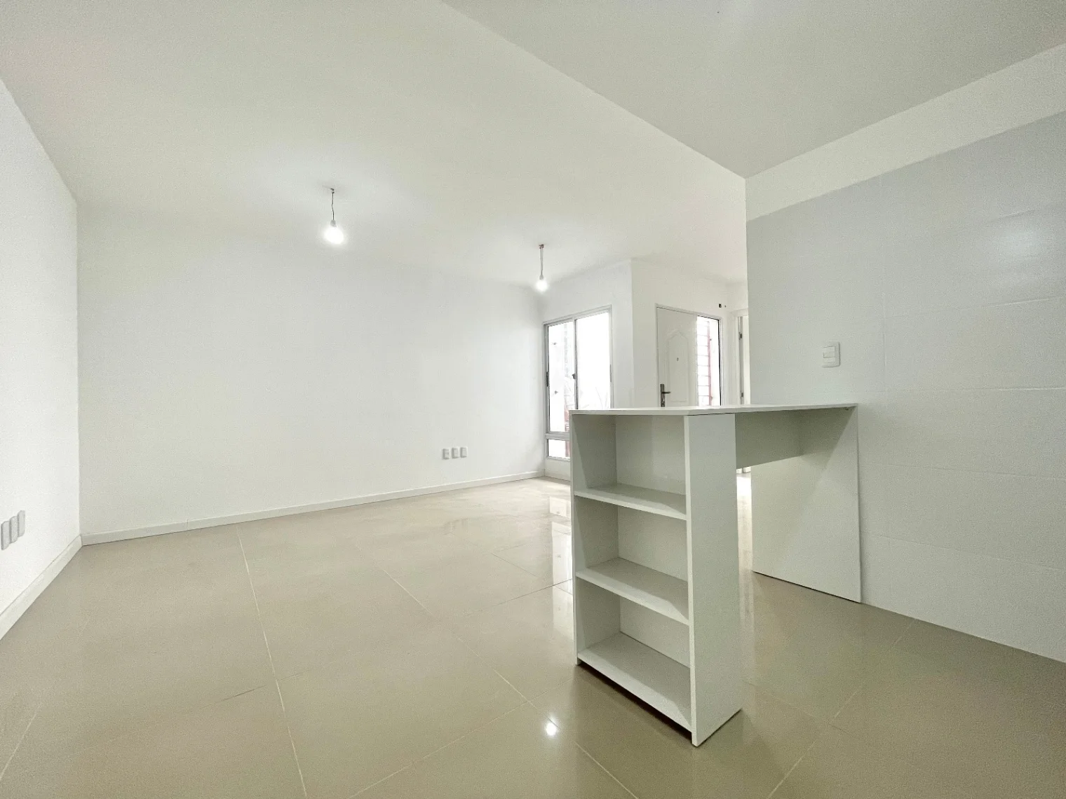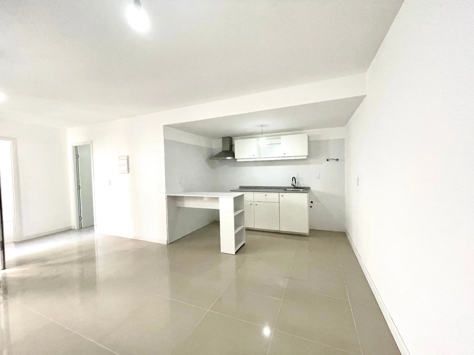 Estar, cocina integrada con campana, y previsión para lavarropas, placares aéreos y bajomesada.
