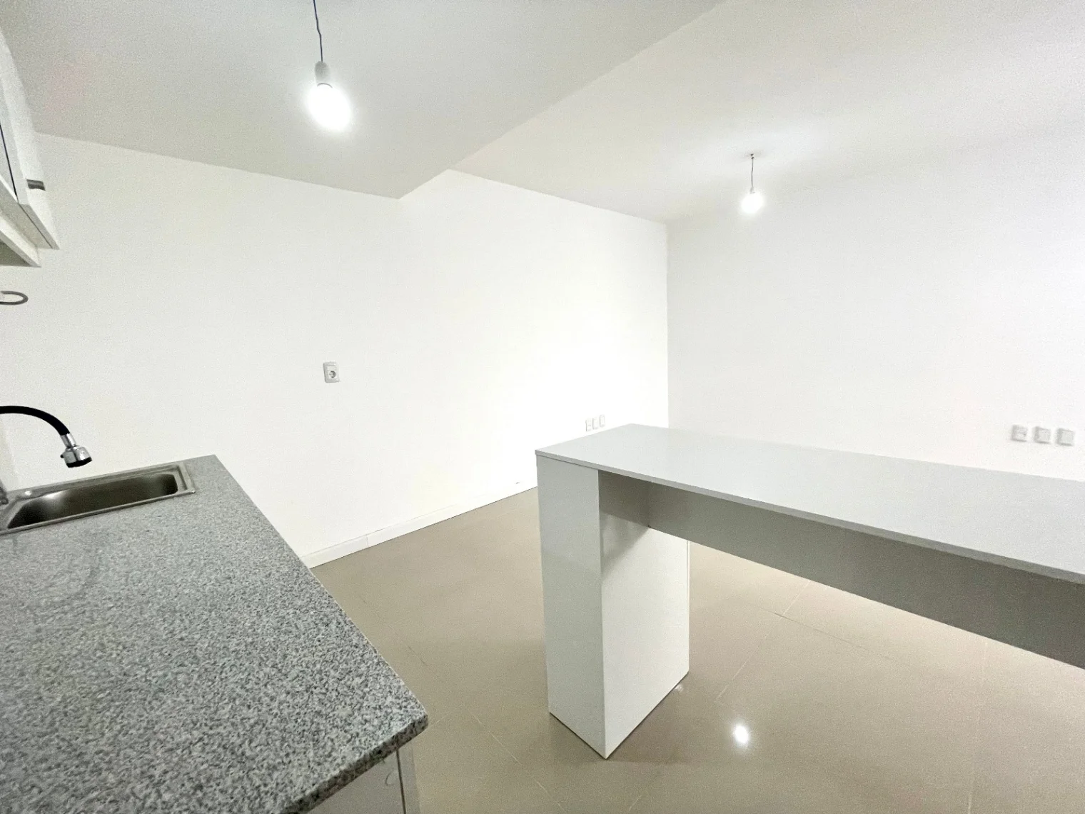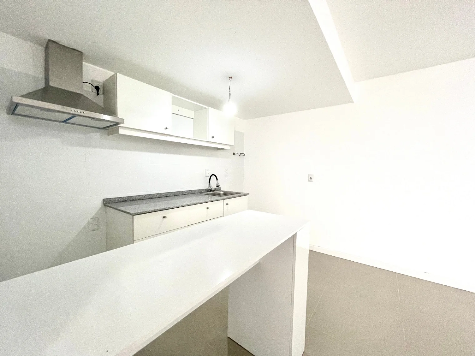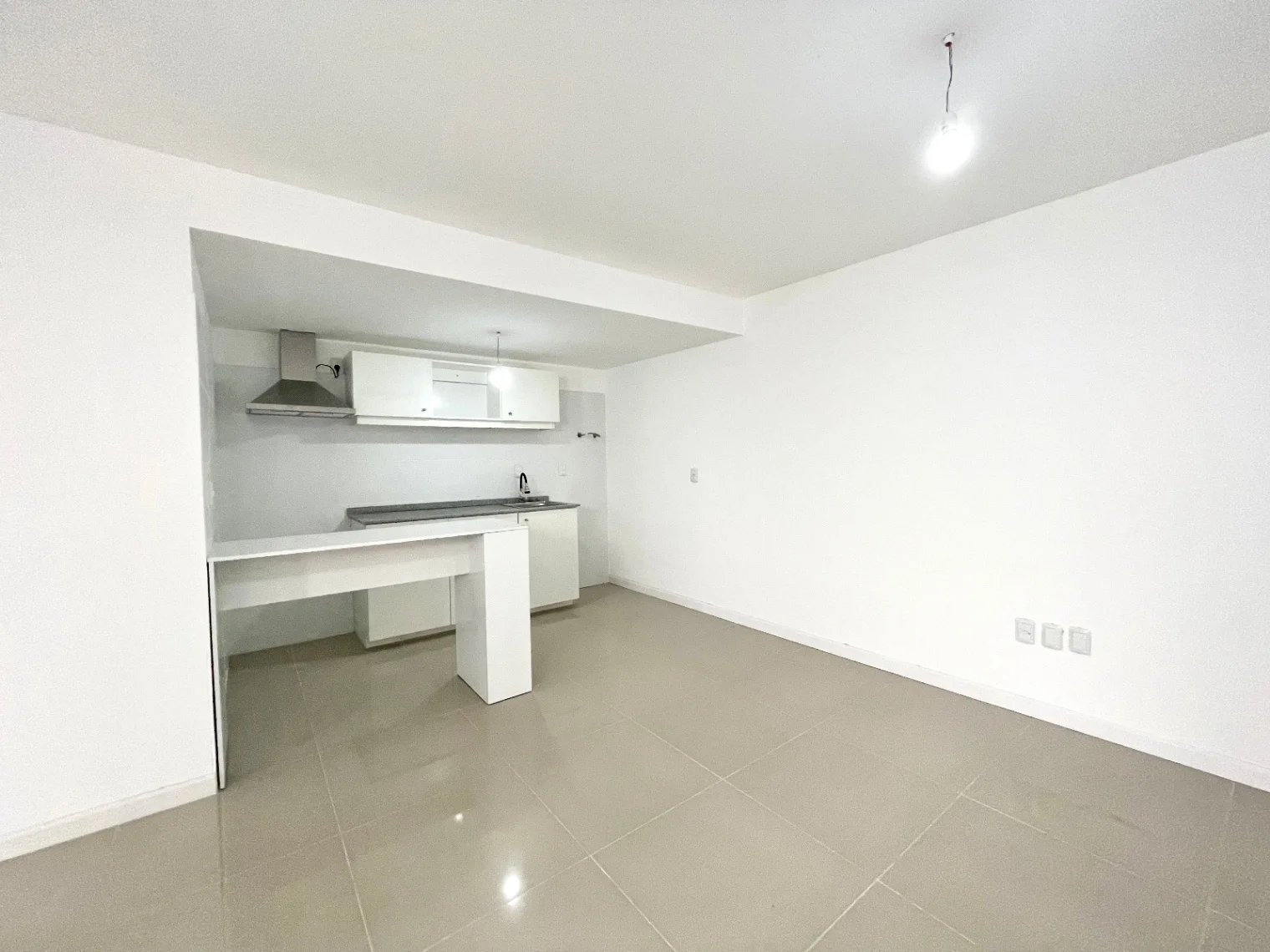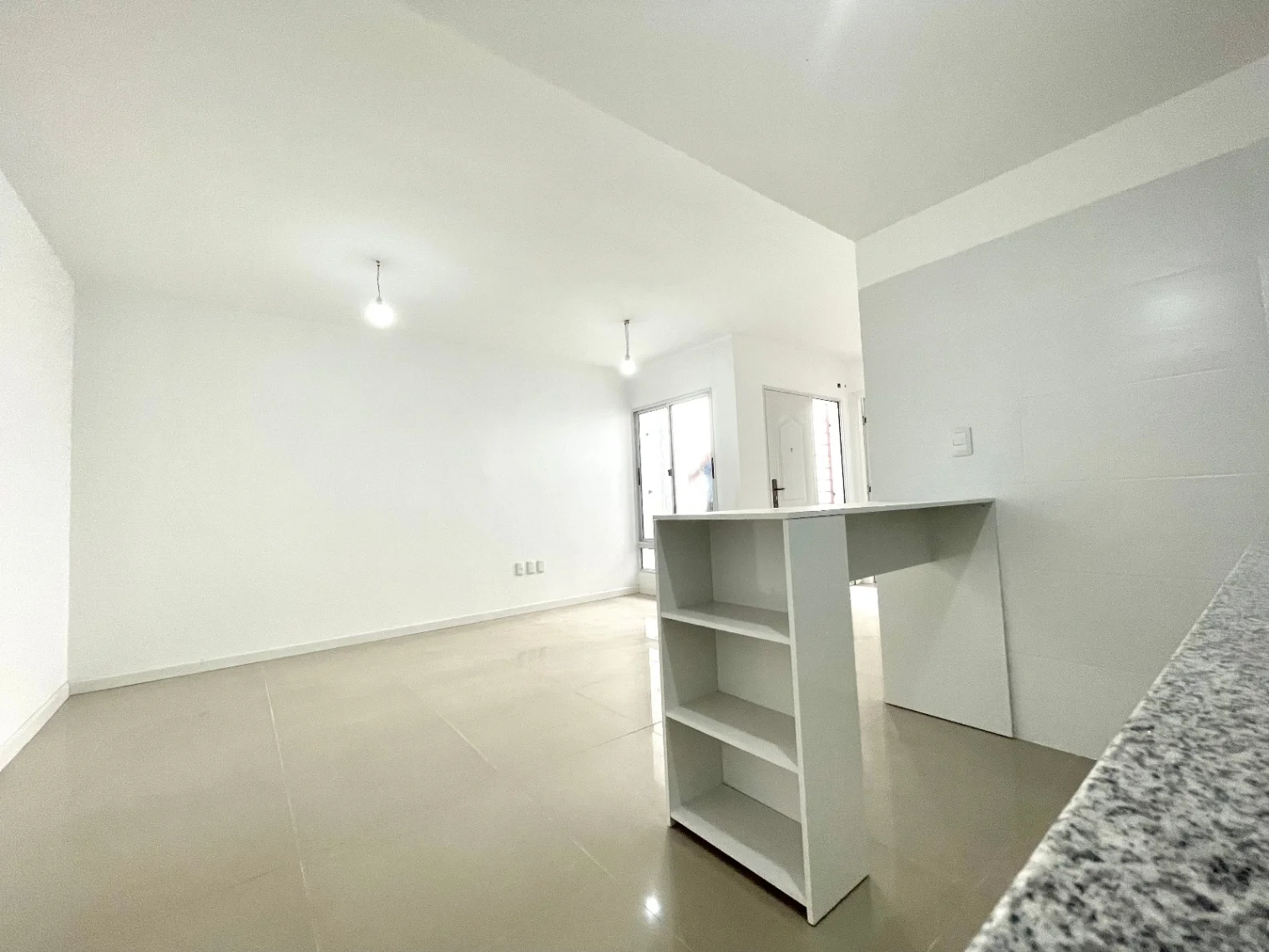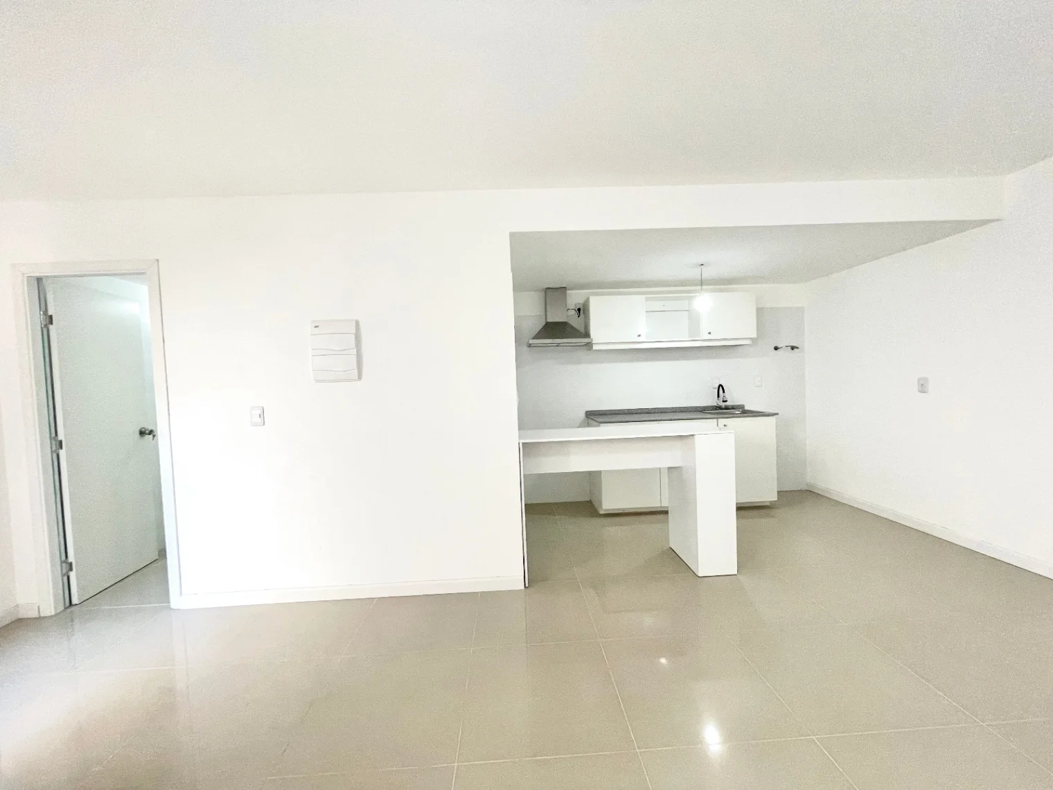 Estar, cocina integrada con campana, y previsión para lavarropas, placares aéreos y bajomesada.