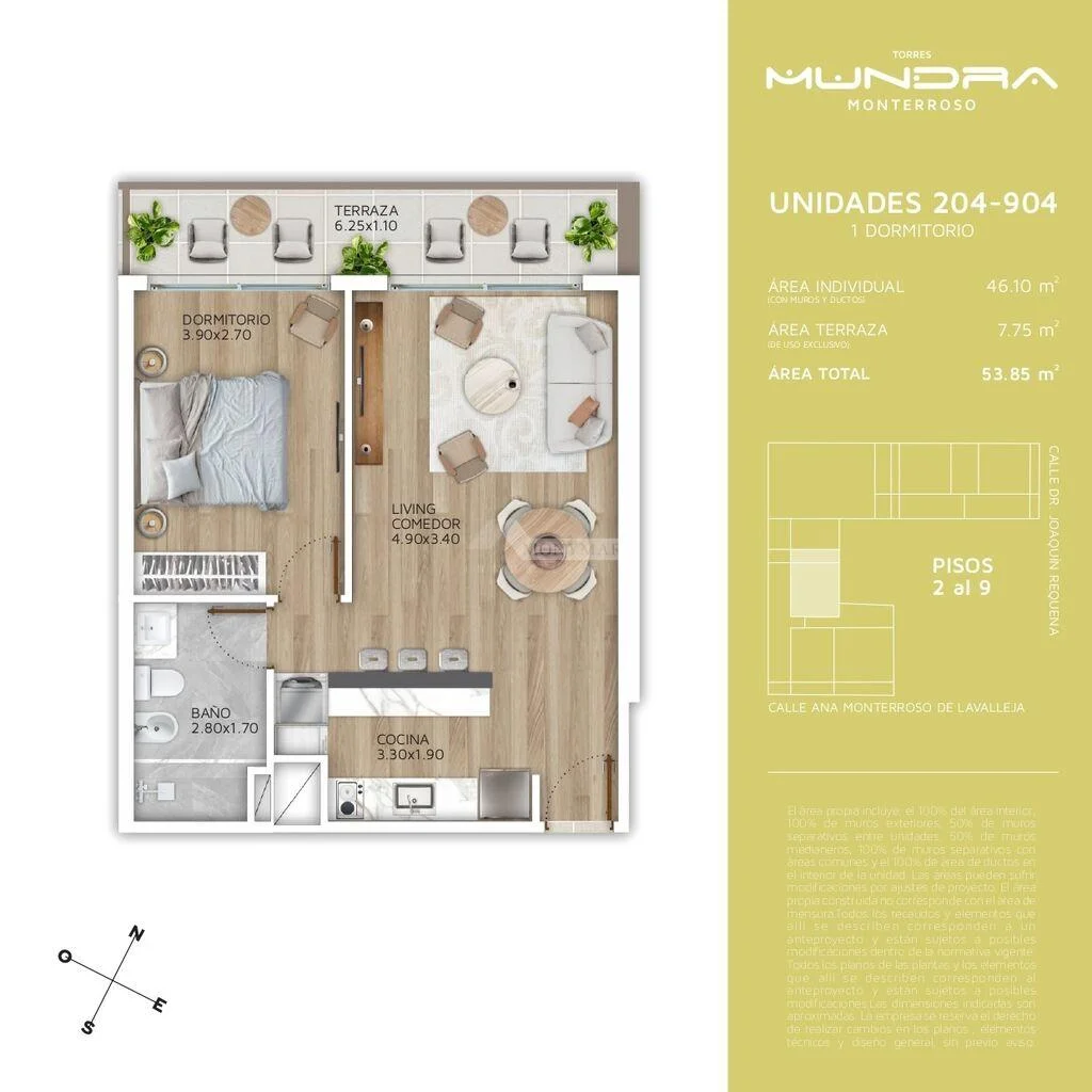 METRAJE: 46,10m área privada + 7,75m área terraza = 53,85m totales