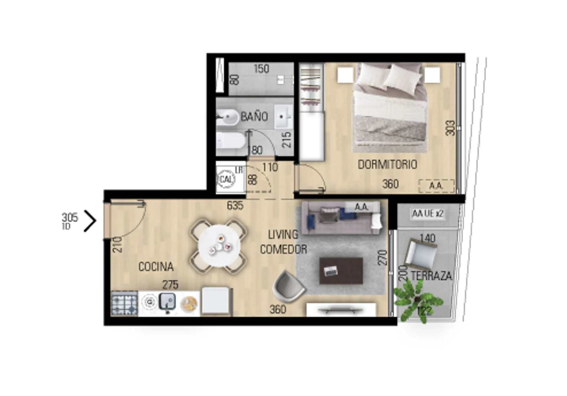 De 1 dormitorio pensado para el disfrute y el aprovechamiento de los espacios, cocina integrada con muebles aéreos y bajo mesada. Baño con terminaciones contemporáneas y materiales de primera calidad. Terraza al frente con salida desde el living y previsión de aire acondicionado en living y dormitorio. Aberturas de aluminio, terminación color negro con cortina de enrollar integrada, pavimento vinílico de alta resistencia en listones símil madera.