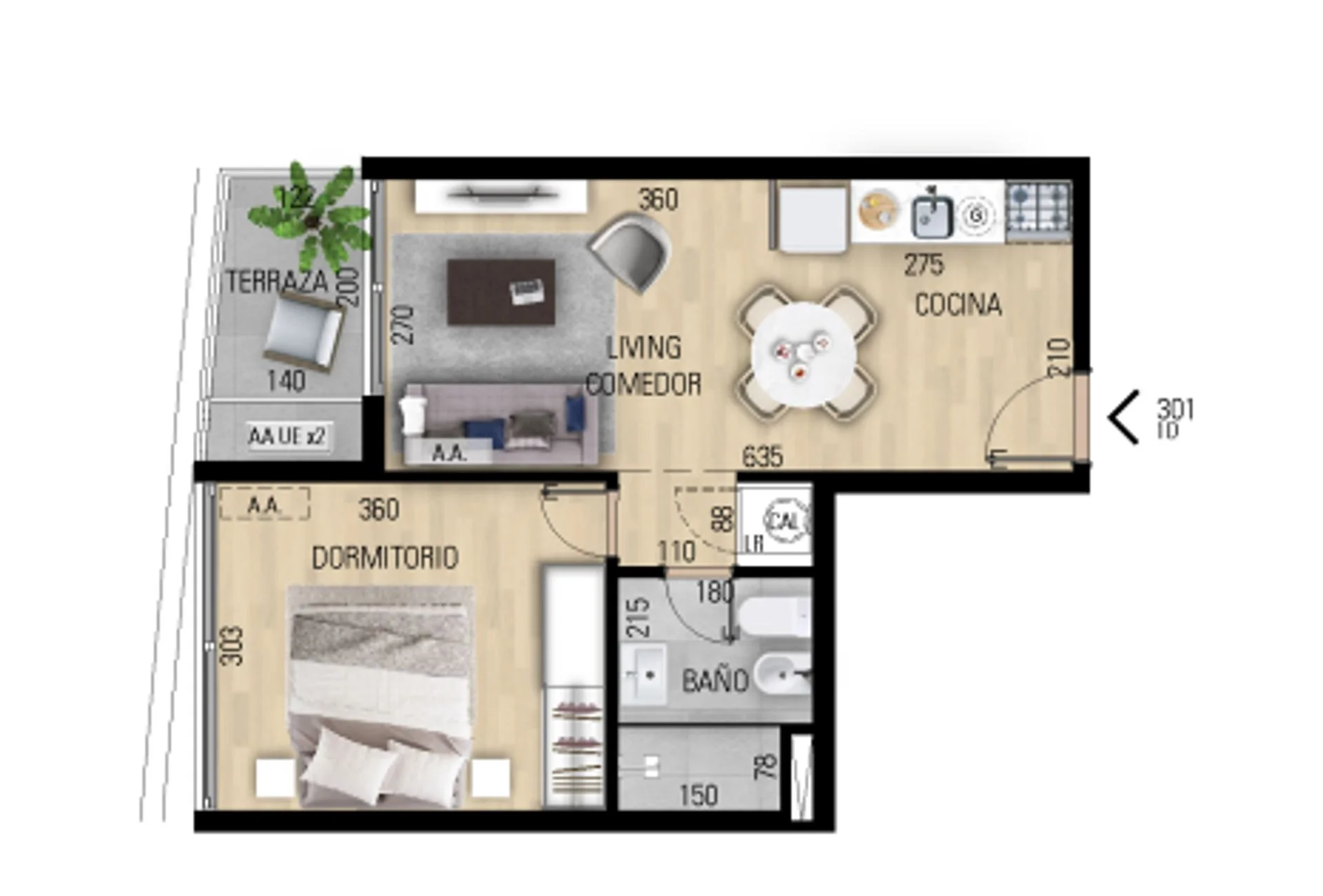 Apartamento unidad 401 en el cuarto piso, de 1 dormitorio con orientación oeste. Pensado para el disfrute y el aprovechamiento de los espacios, cocina integrada con muebles aéreos y bajo mesada. Baño con terminaciones contemporáneas y materiales de primera calidad. Terraza al frente con salida desde el living y previsión de aire acondicionado en living y dormitorio. Aberturas de aluminio, terminación color negro con cortina de enrollar integrada, pavimento vinílico de alta resistencia en listones símil madera.
