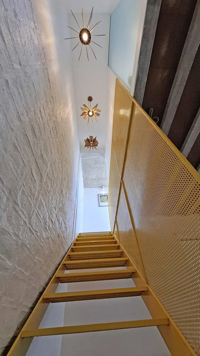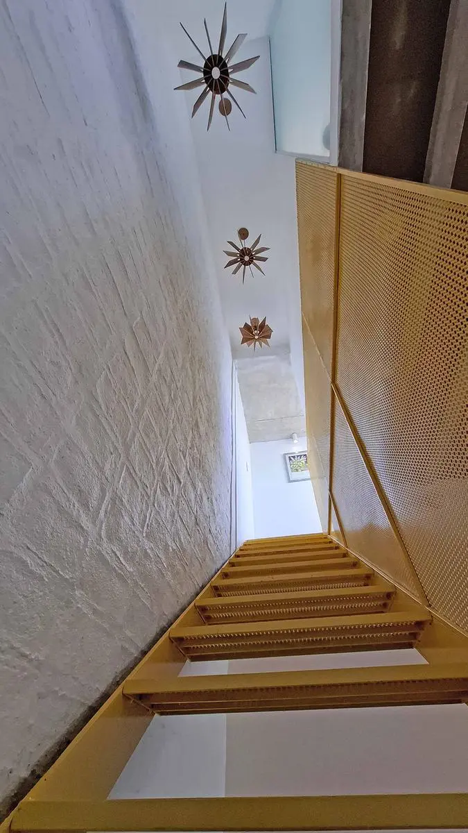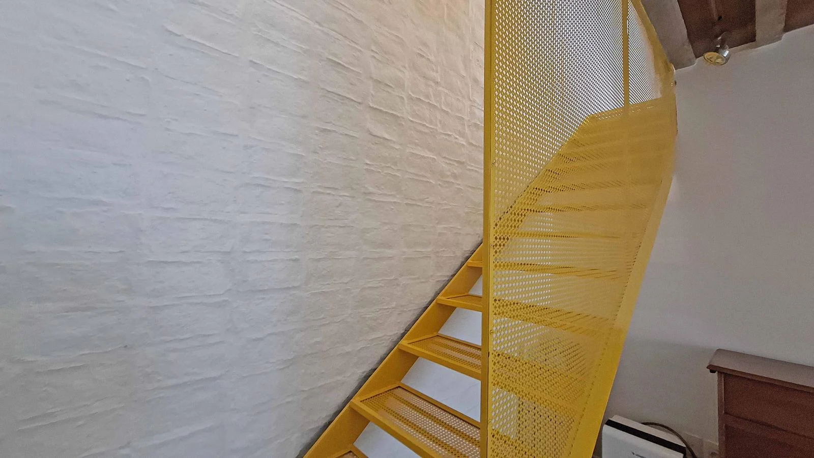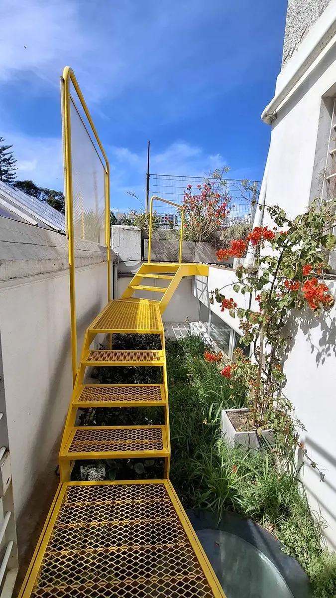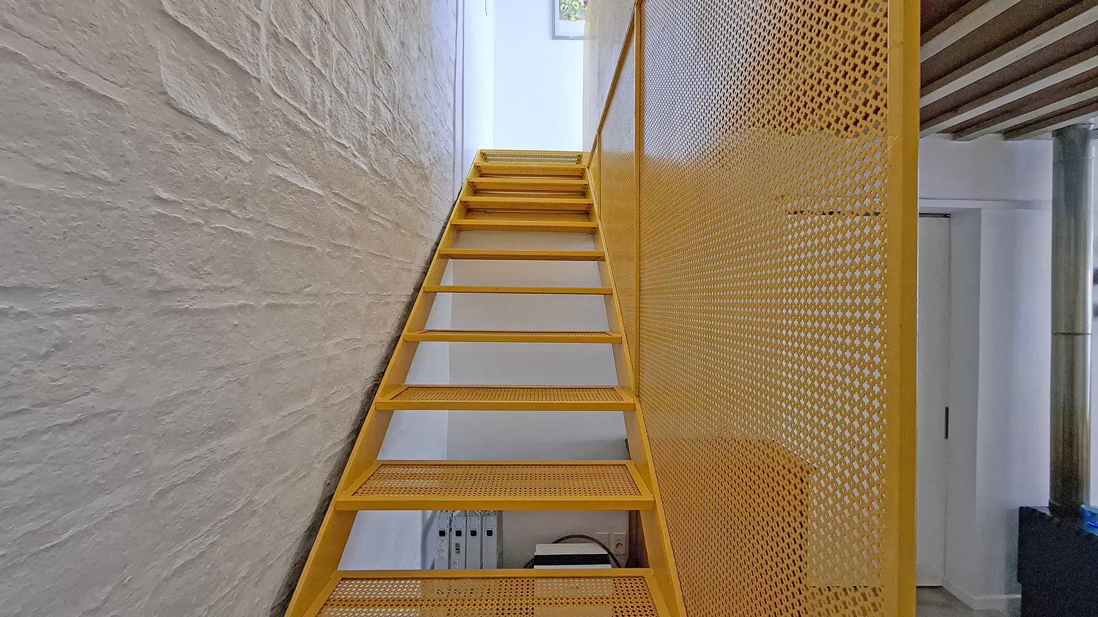 Escalera metálica en color amarillo que aporta un toque moderno y original.