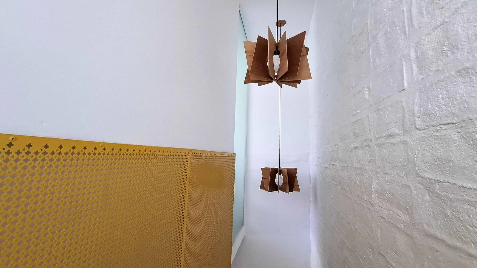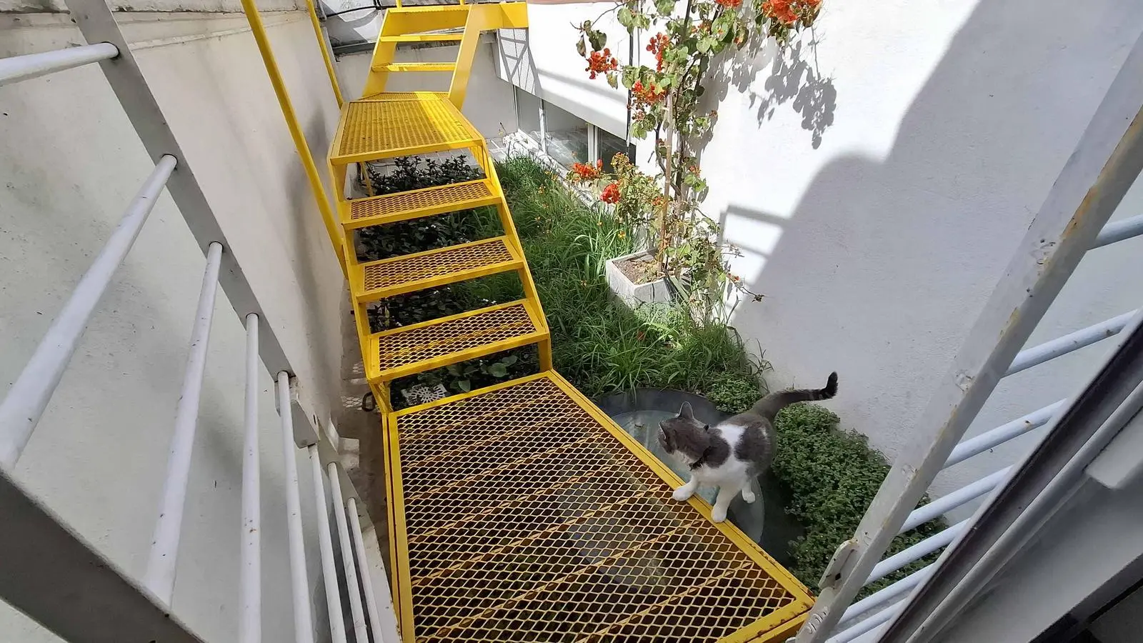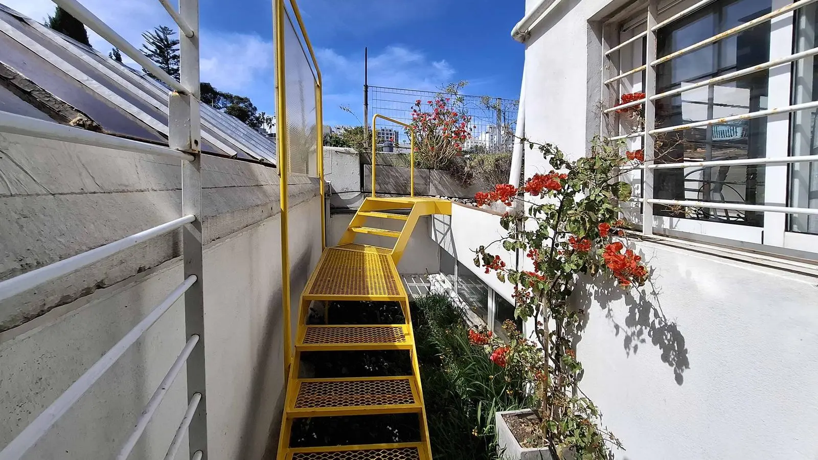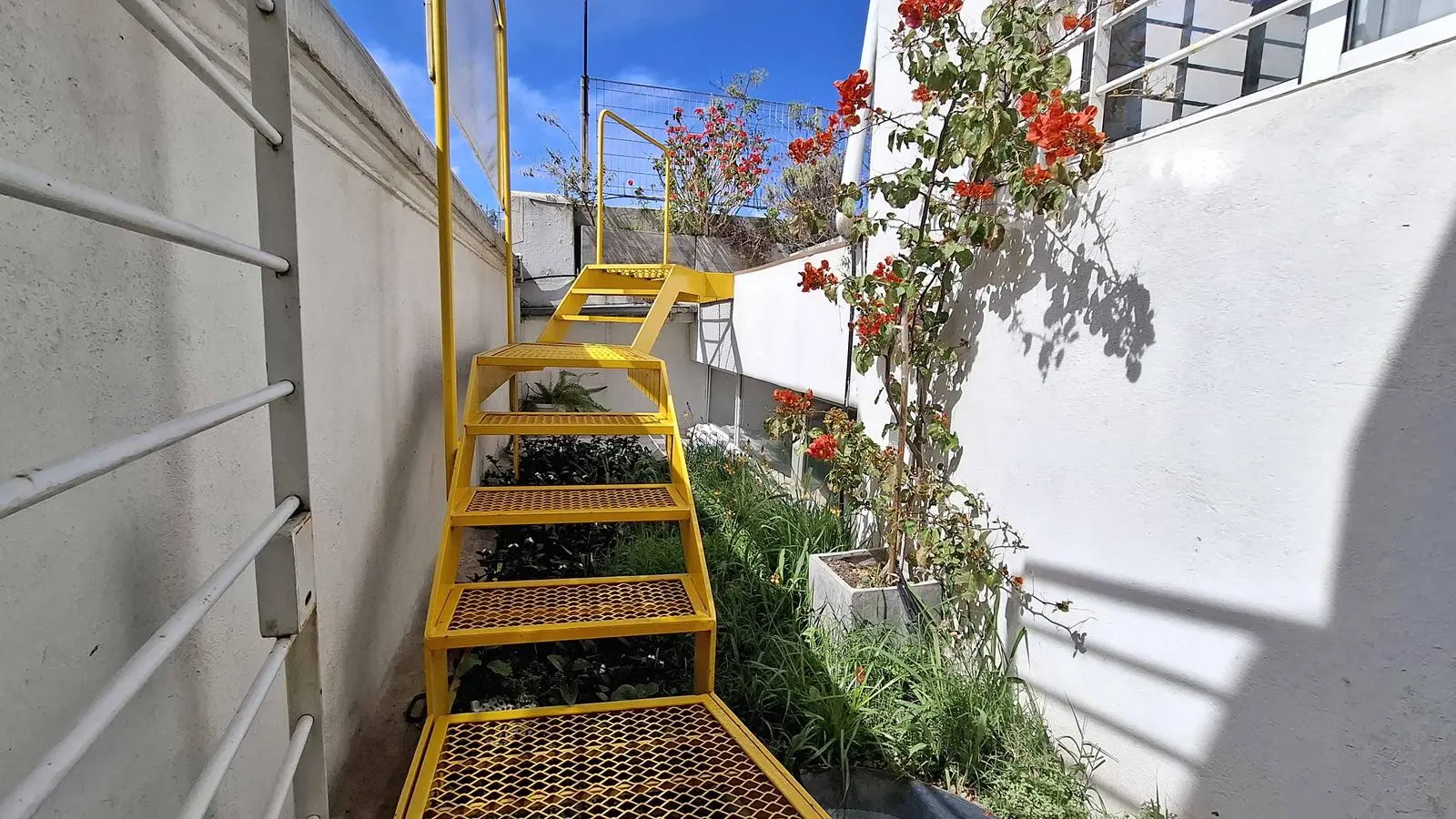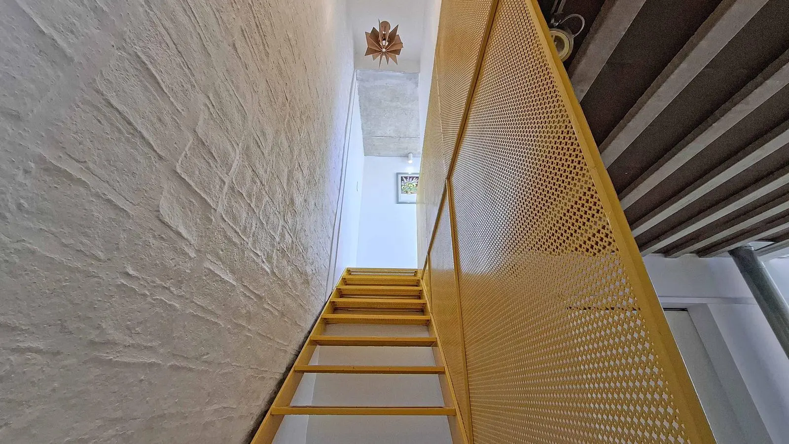 Escalera metálica en color amarillo que aporta un toque moderno y original.