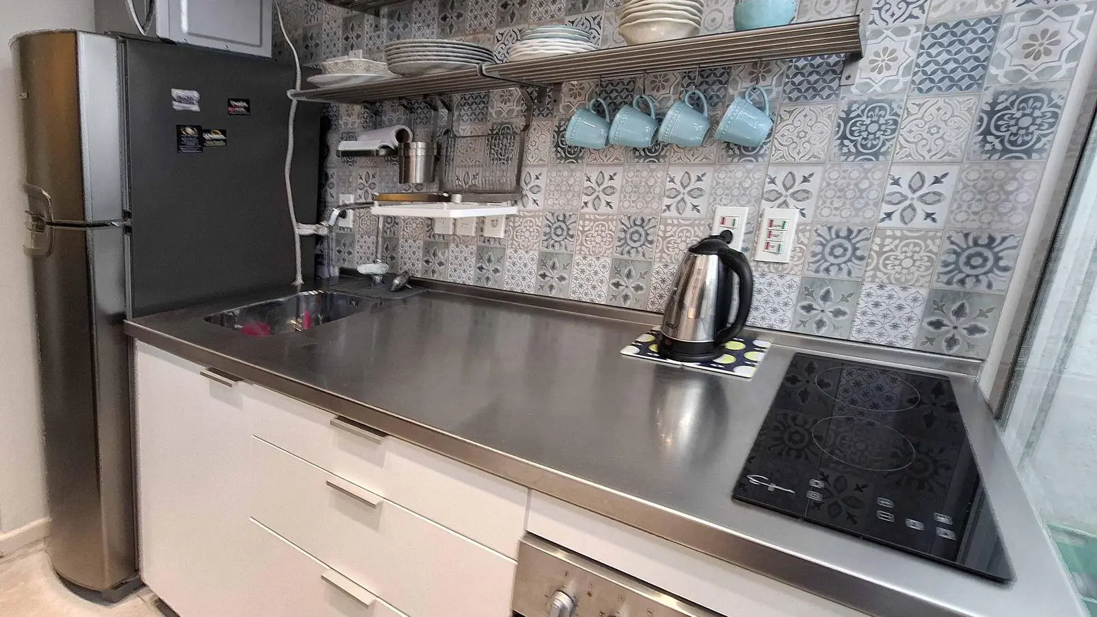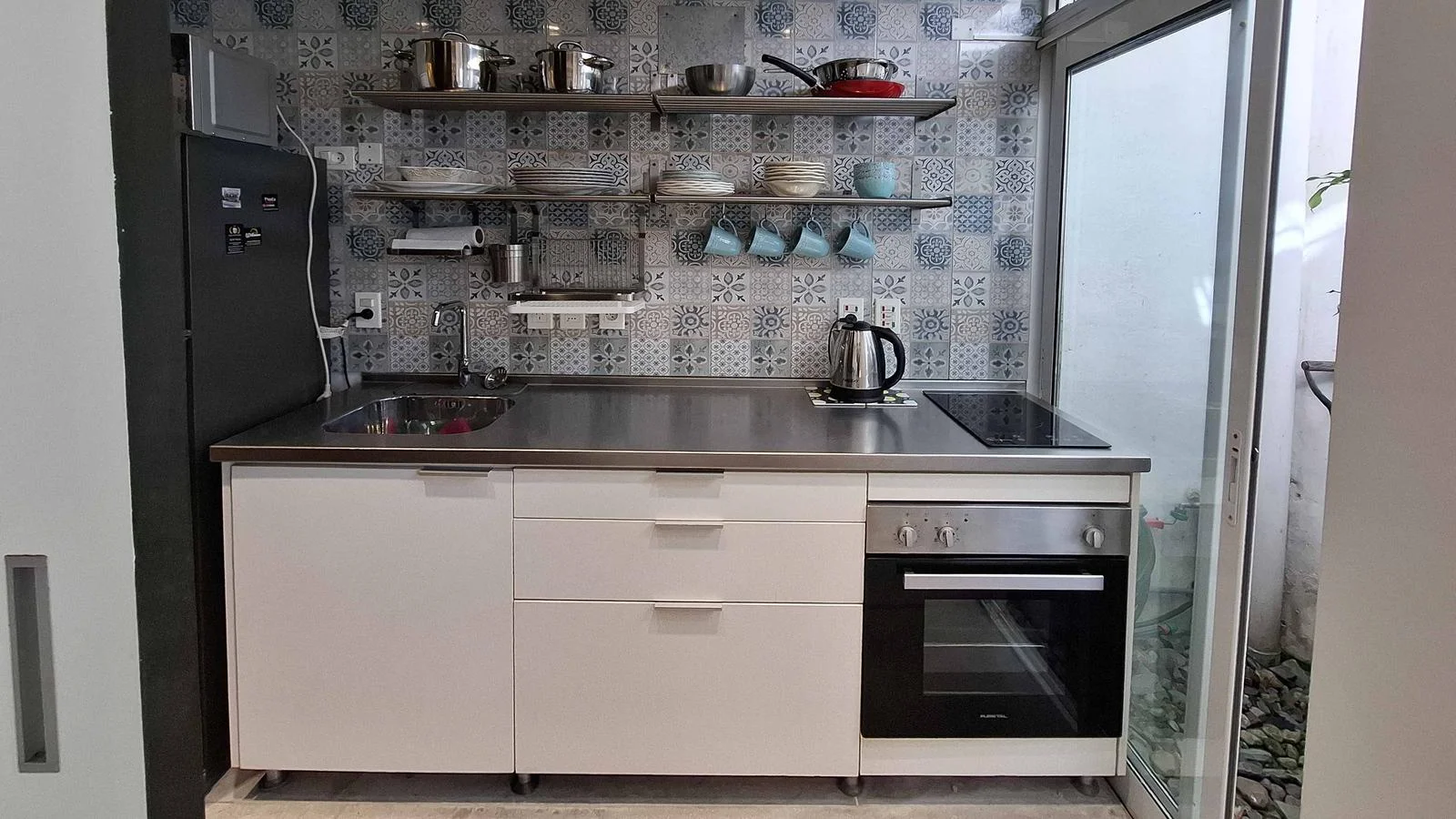Cocina definida, equipada con muebles bajo mesada y estantes.