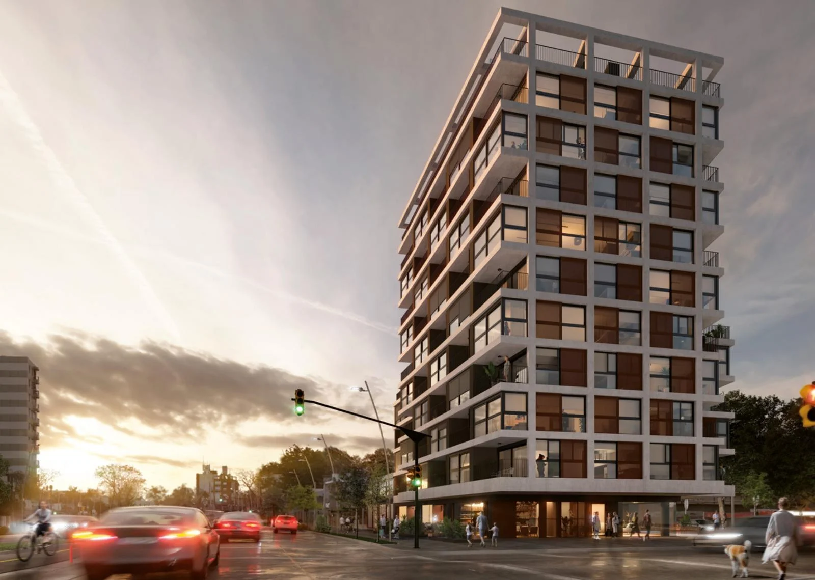 El edificio se desarrolla en 12 niveles, con 2 subsuelos de estacionamiento, locales comerciales en planta baja y espacios pensados para la vida moderna.