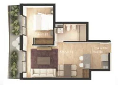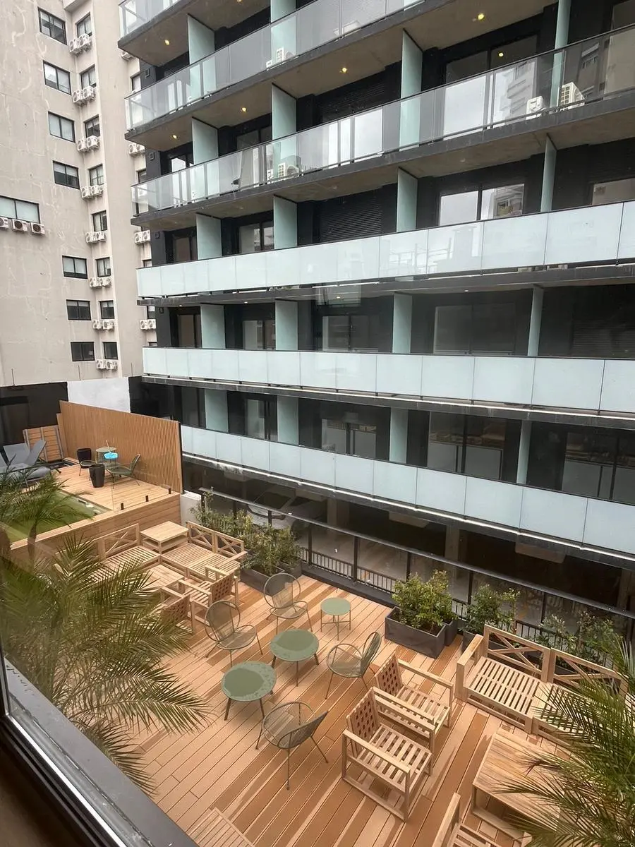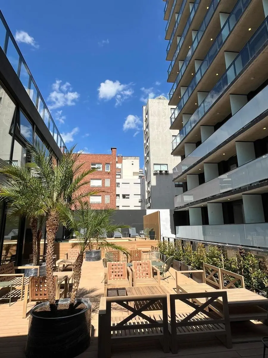 El apartamento en piso alto, Sala de estar con cocina integrada con muebles bajo y sobre mesada. 1 dormitorio con placard. Desde ambos ambientes se accede hacia la generosa terraza al frente. Baño completo.