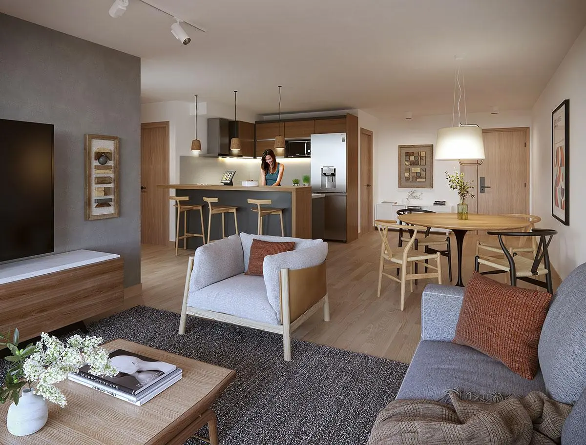 Apartamento que combina la sala de estar con el comedor, y cocina integrada.1 Dormitorio. Estos ambientes se extienden hacia la terraza generando mayor amplitud y un espacio extra de esparcimiento. Baño Completo.
