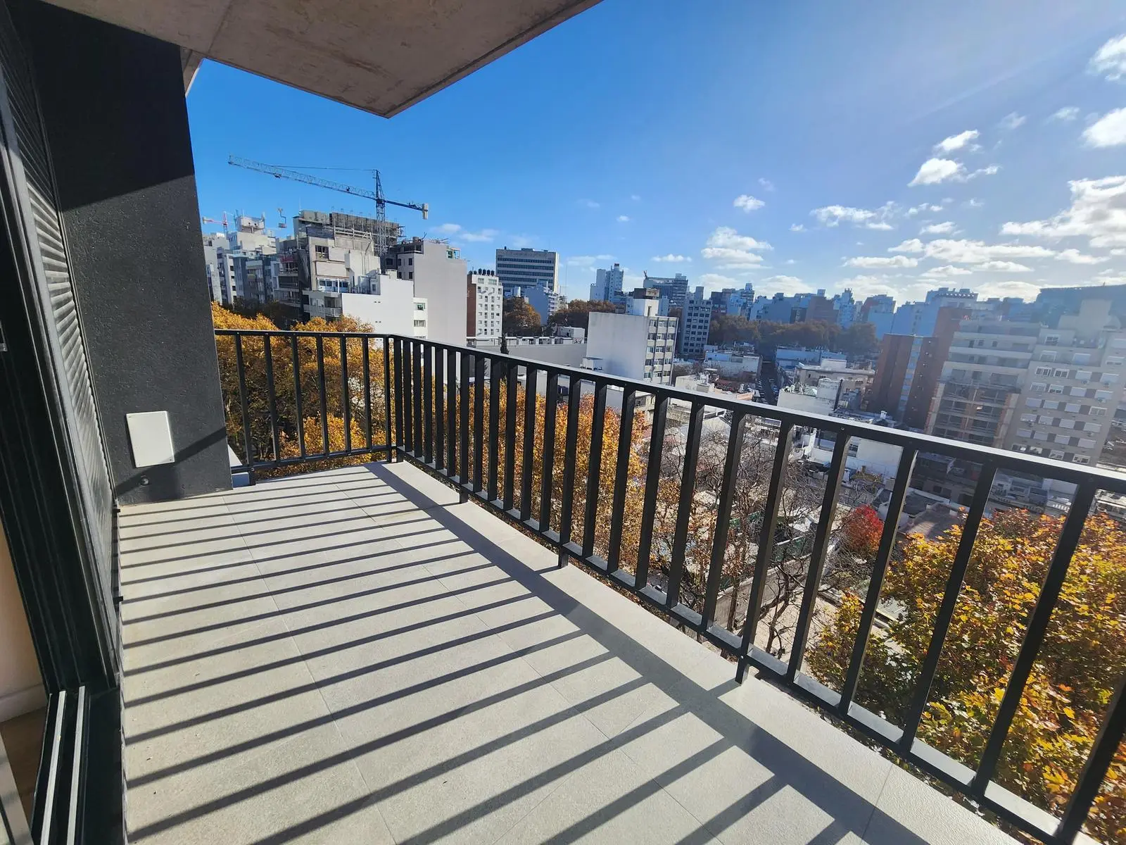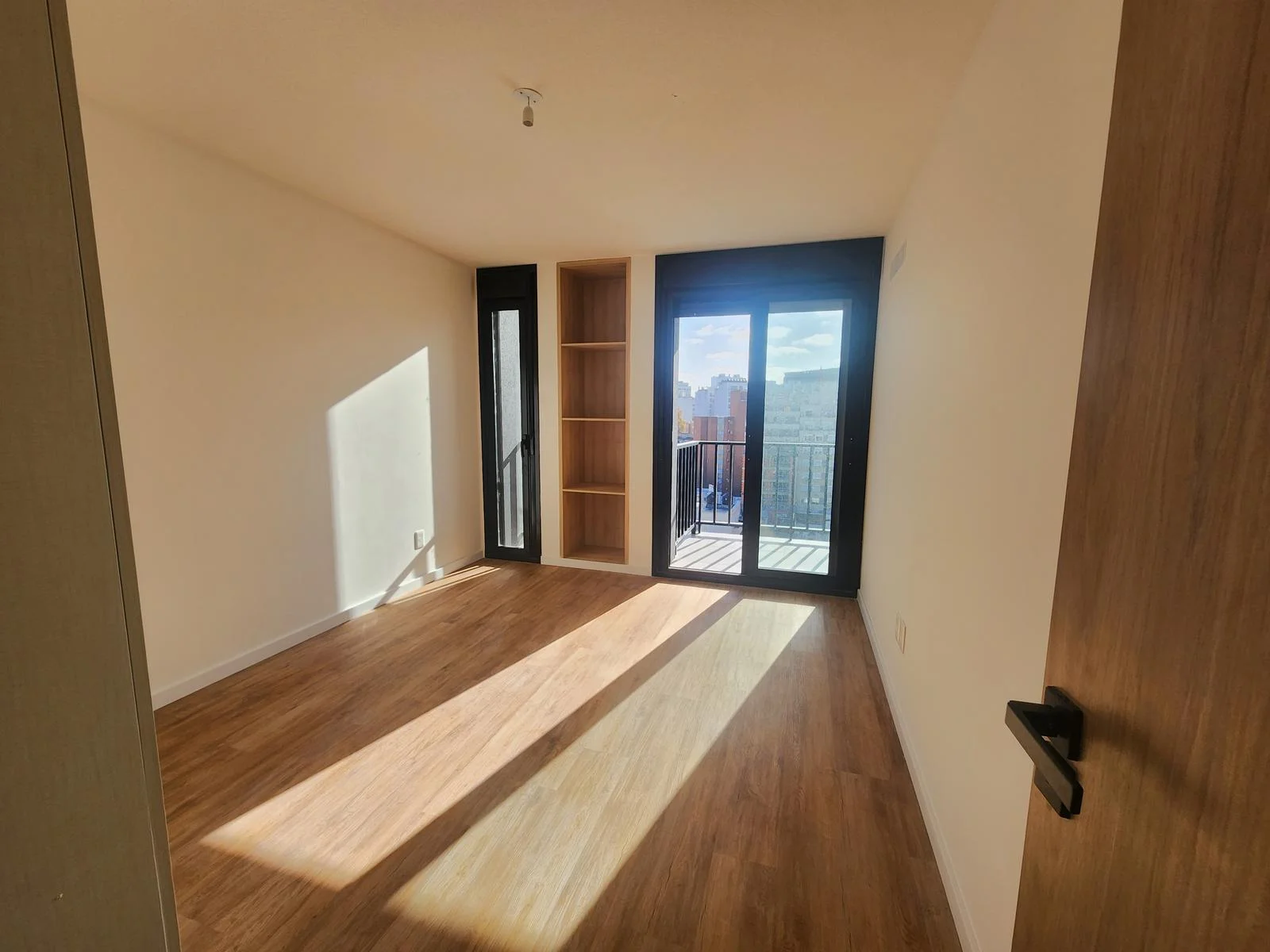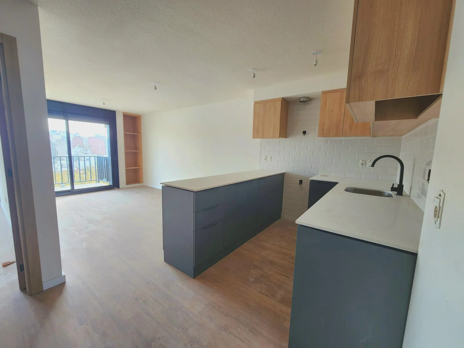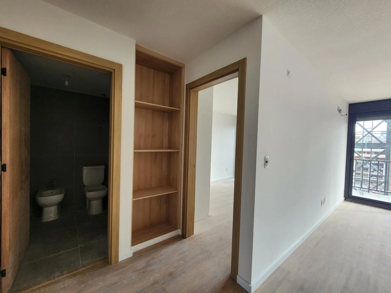 Apartamento Living comedor con 3 estanterías empotradas, cocina integrada con mueble bajo mesada y aéreos. Acceso a terraza de uso exclusivo, un dormitorio con placard. Baño completo.