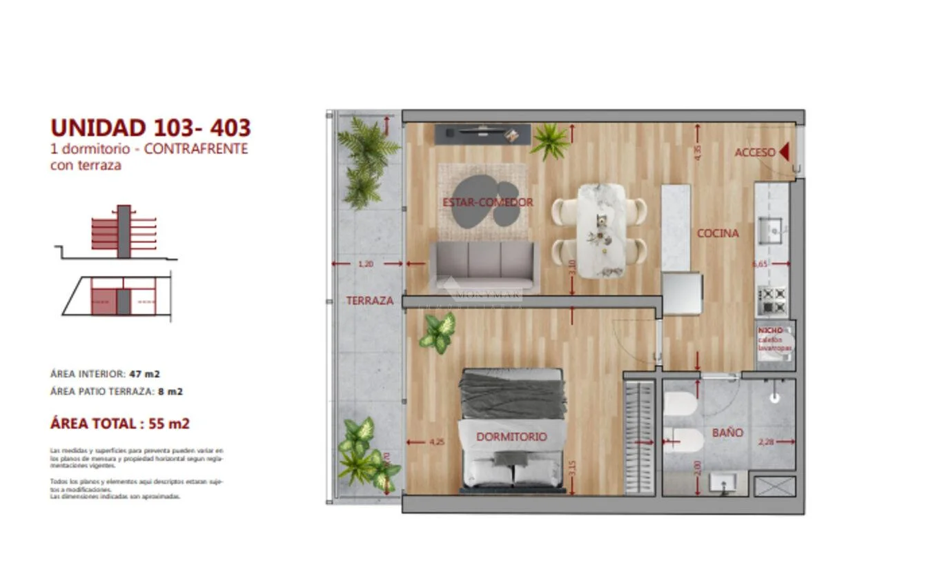 103 - 303) 47m2 Construidos + 8m2 de Terraza = 55m2 Totales.