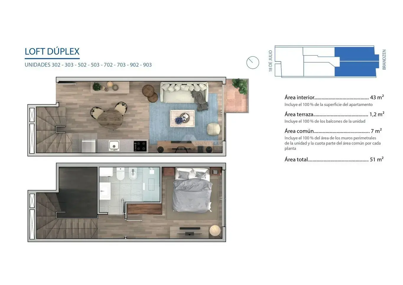 43m2 área propia c/muros + 7m2 área común + 1,2m2 terraza = 51m2 totales.