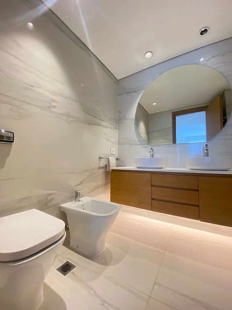 2 baños completos más toilette social, incluyen mamparas y espejos.