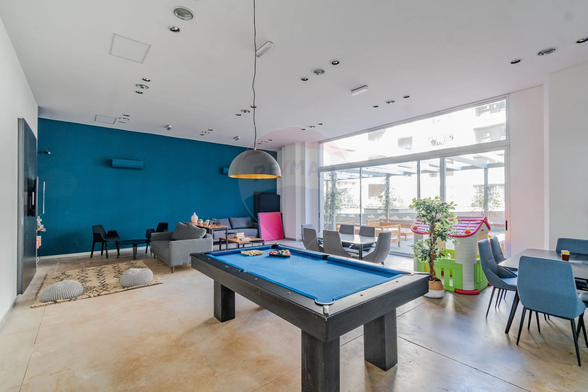 - Salón para adultos con TV LCD, mesa de pool y juegos de mesa.